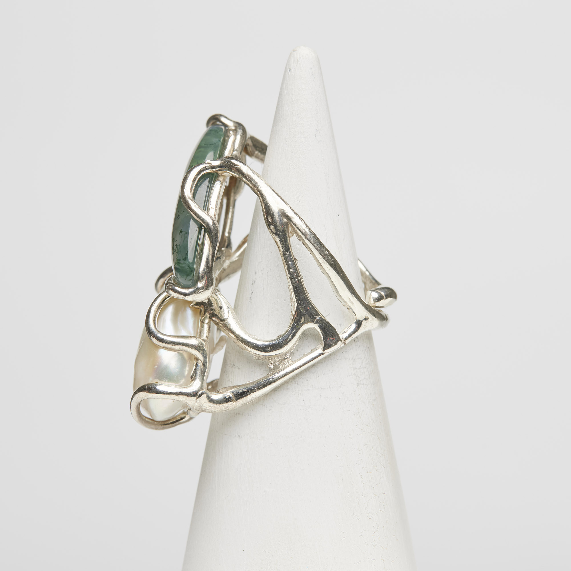 Anello Regolabile in Argento 925‰ rodiato, realizzato artigianalmente in Italia, con Agata Muschiata e Perla d’acqua dolce piatta.