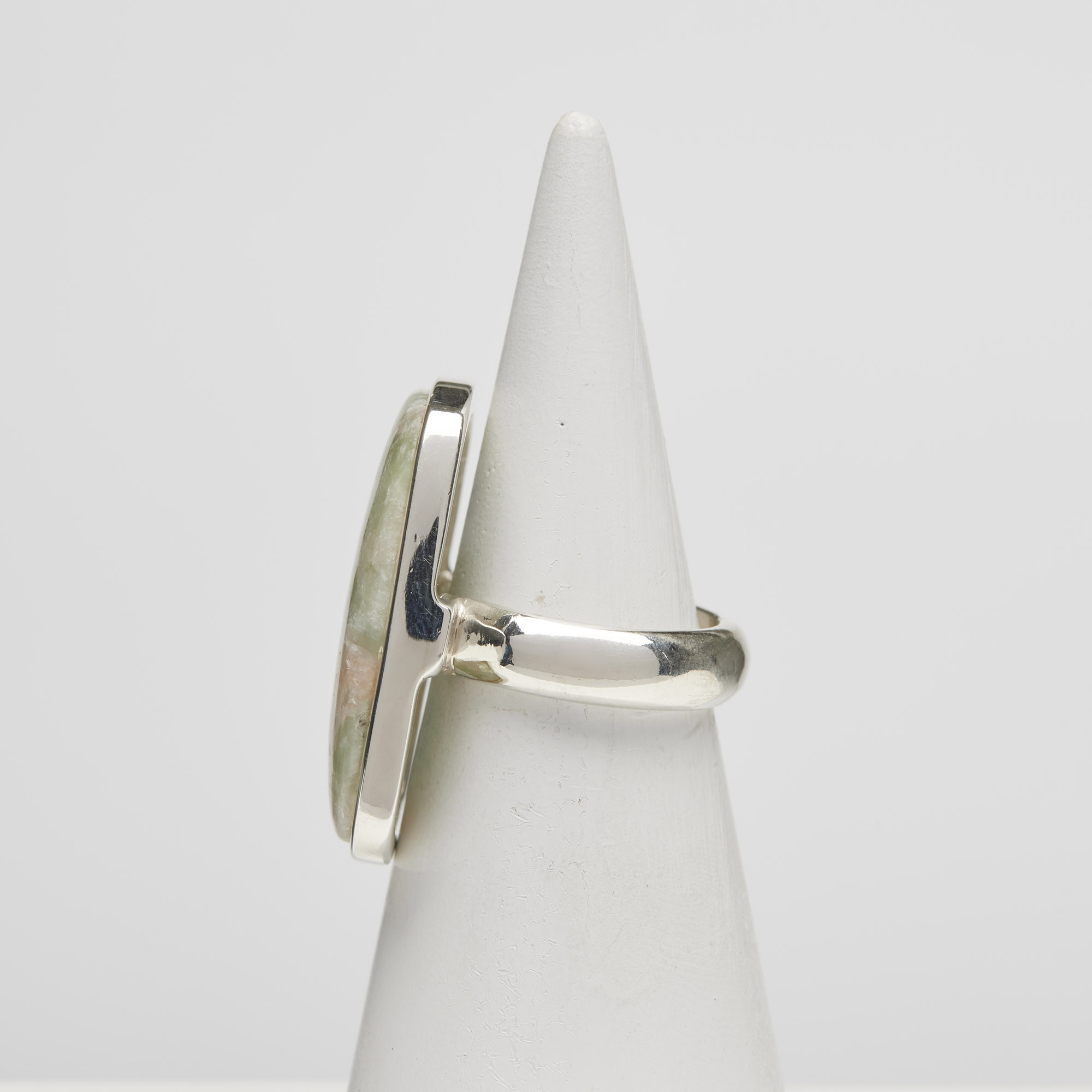 Anello in Argento 925‰, realizzato artigianalmente, con Apofillite a cabochon liscio.
