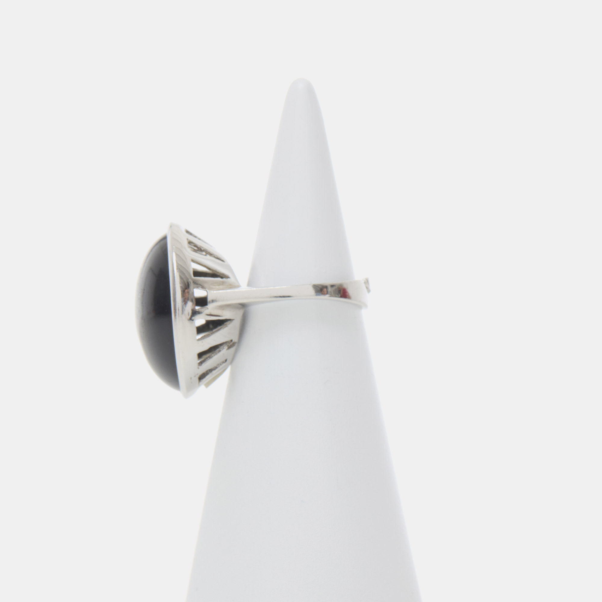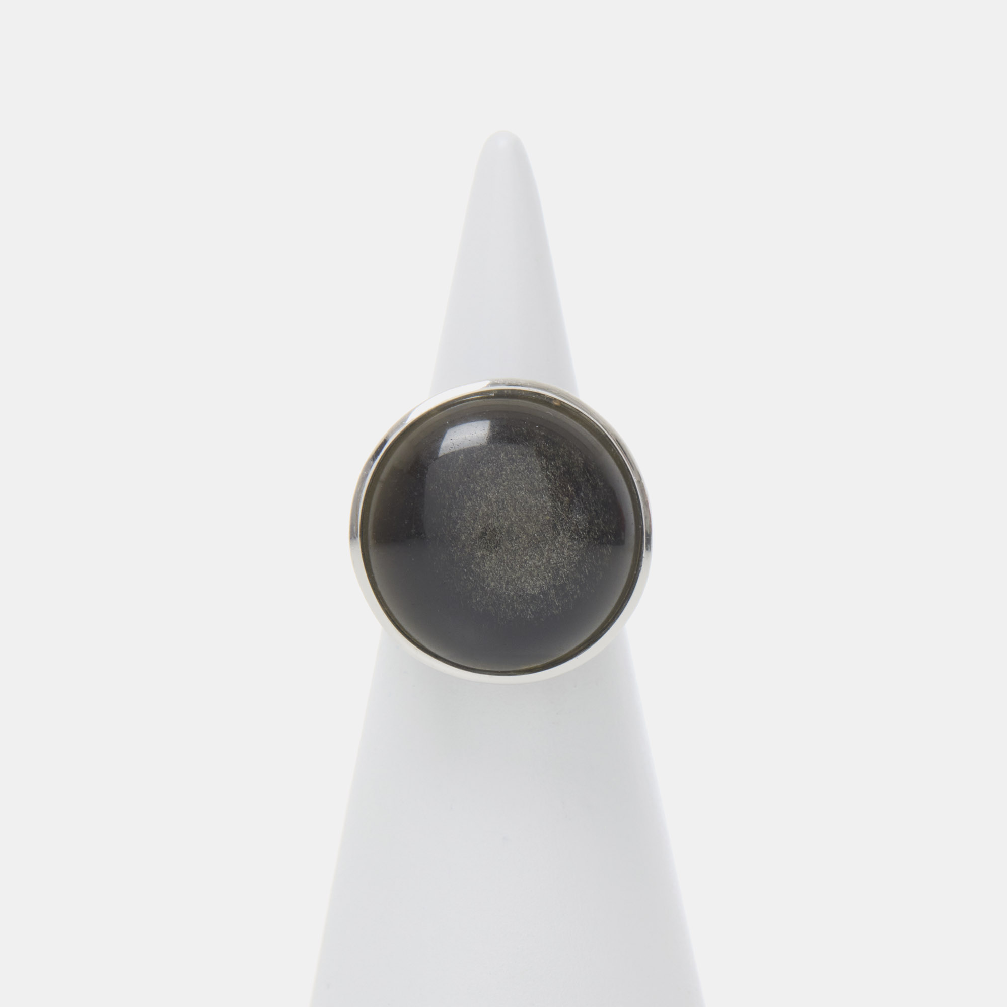 Anello regolabile in Argento 925‰ rodiato, realizzato artigianalmente, con Ossidiana Gold a cabochon liscio.