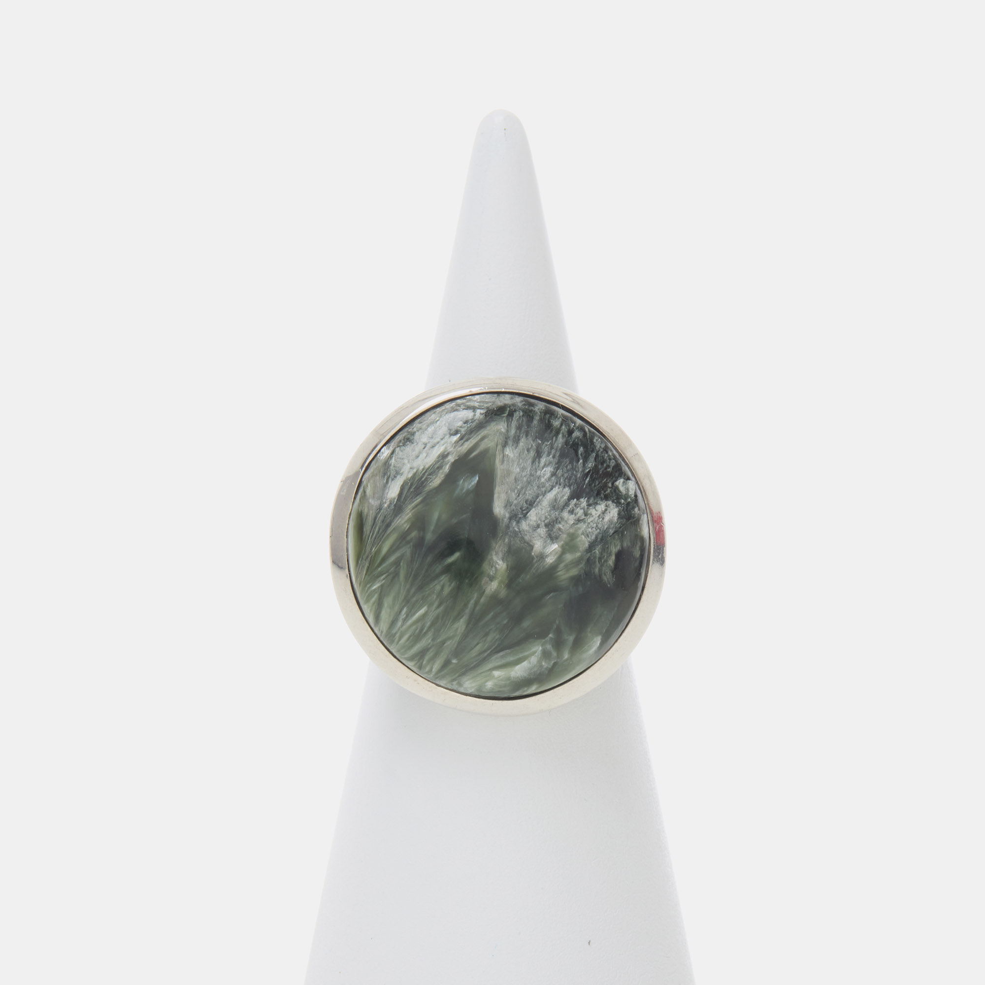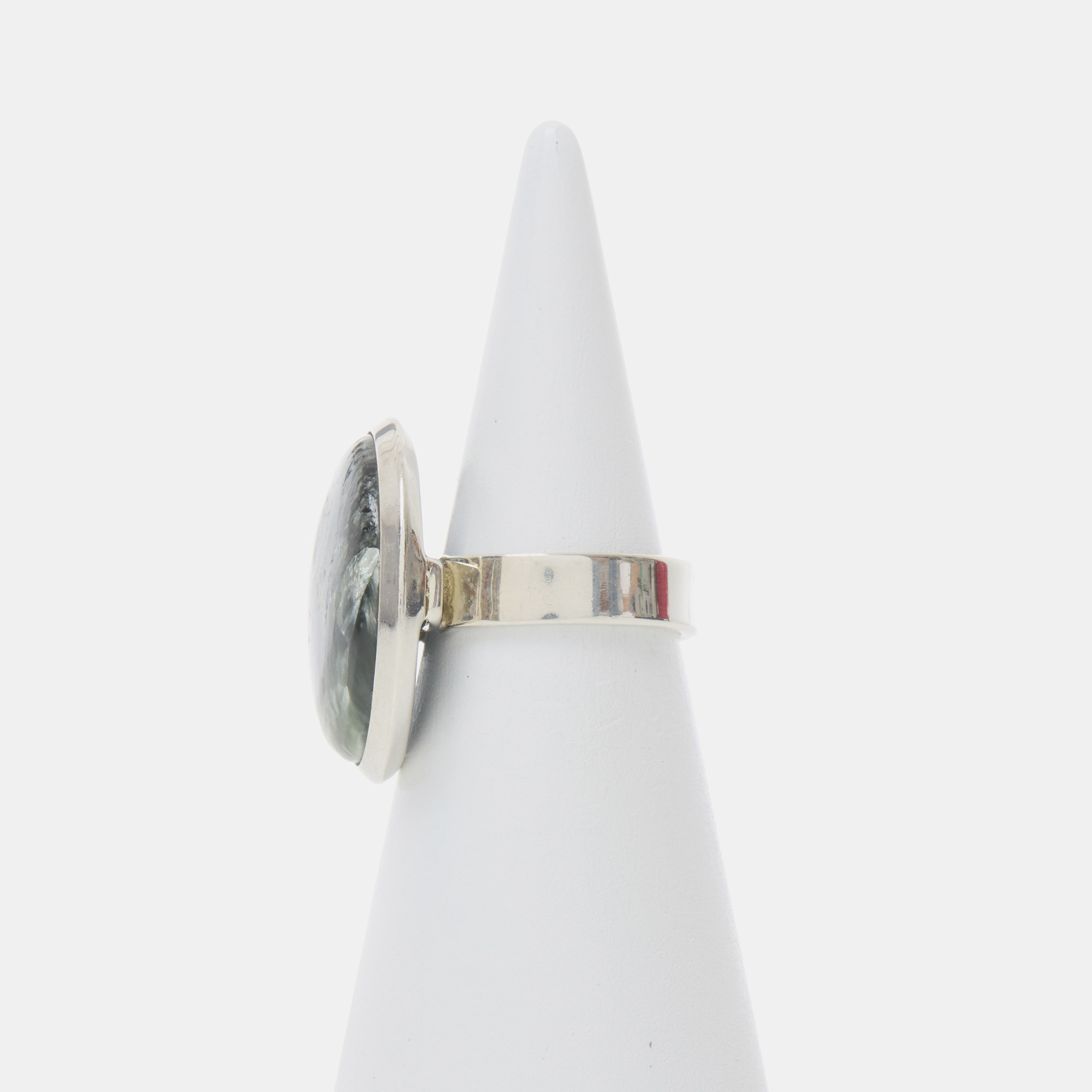 Anello in Argento 925‰, realizzato artigianalmente, con Serafinite a Cabochon liscio tondo.