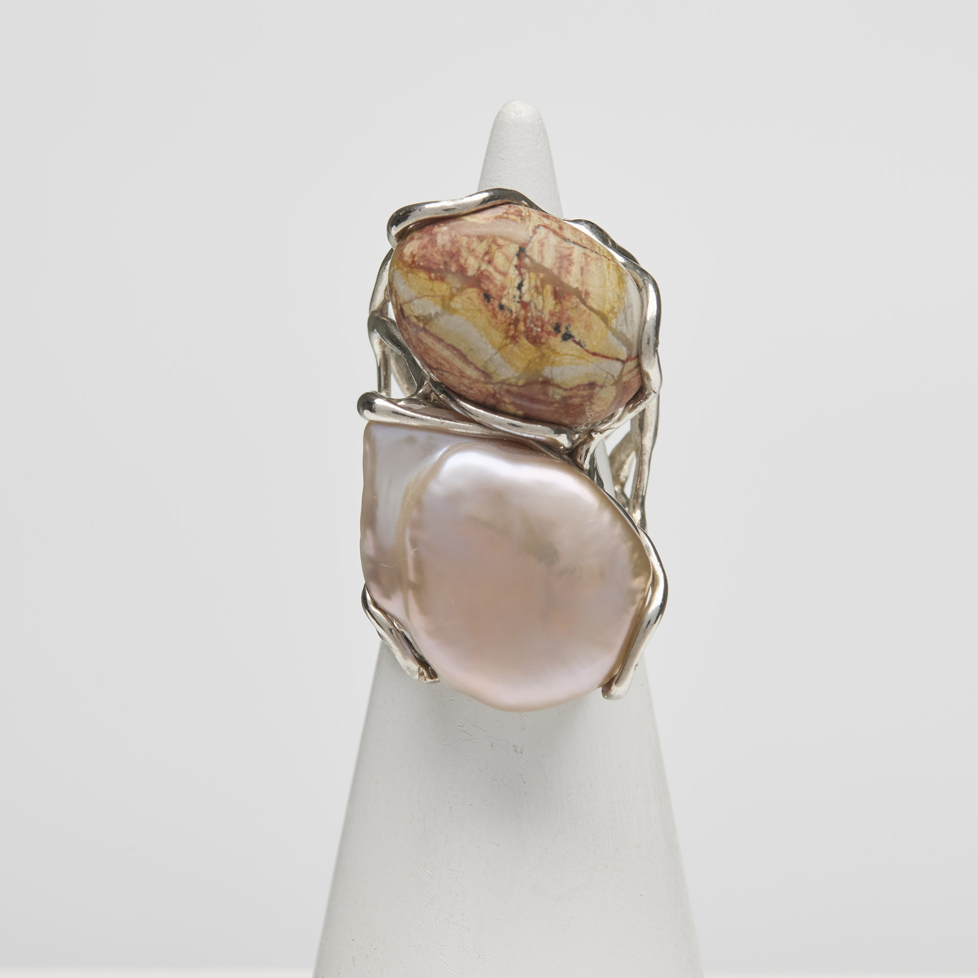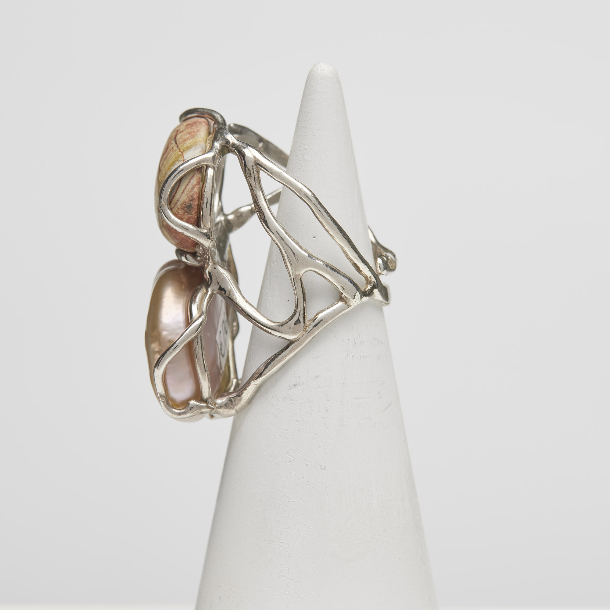 Anello Regolabile in Argento 925‰ rodiato, realizzato artigianalmente in Italia, a due pietre con Diaspro e Perla d’acqua dolce