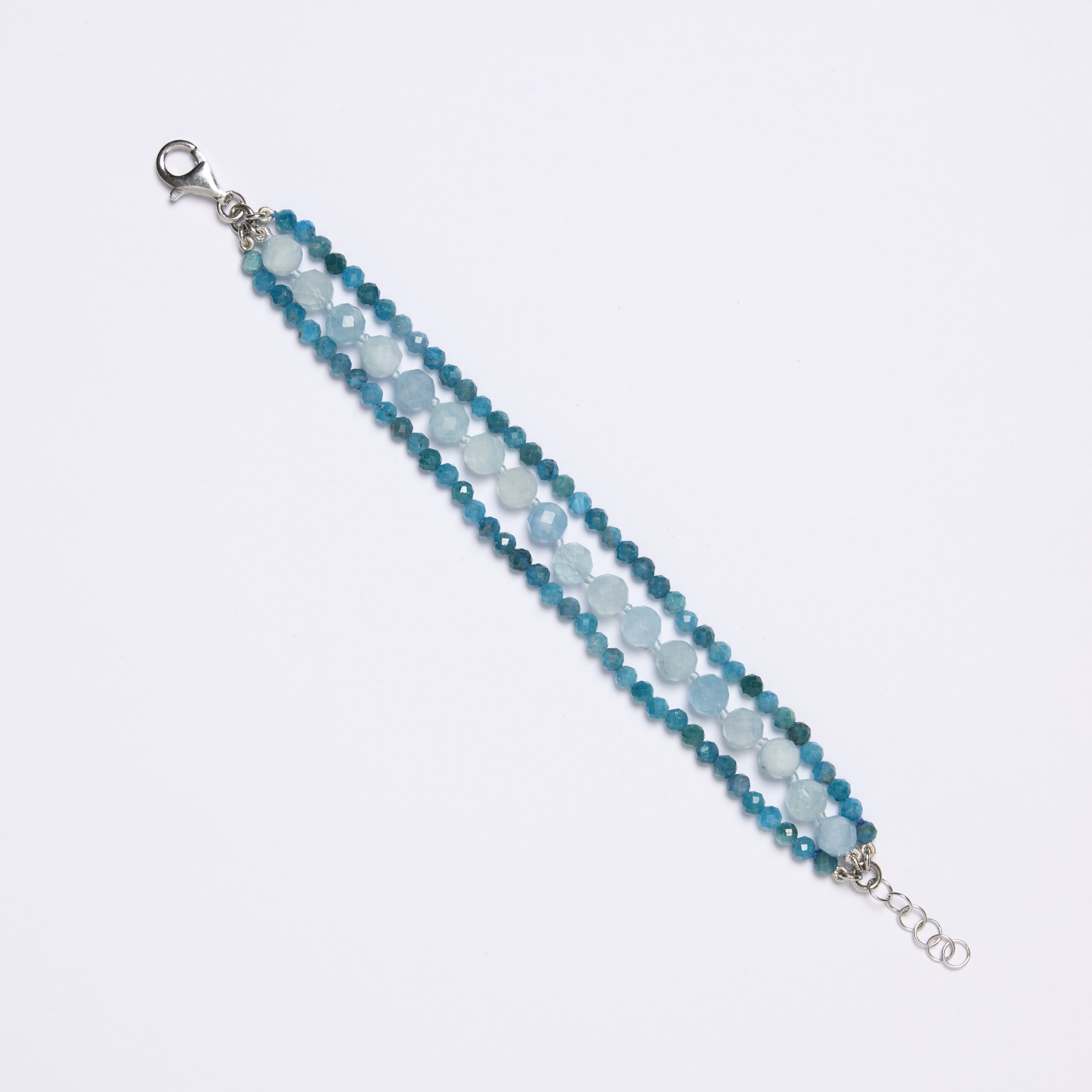 Bracciale infilato a tre fili in Apatite ed Acquamarina a sfera sfaccettata. Chiusura in argento 925‰ rodiato. Realizzato in Italia.