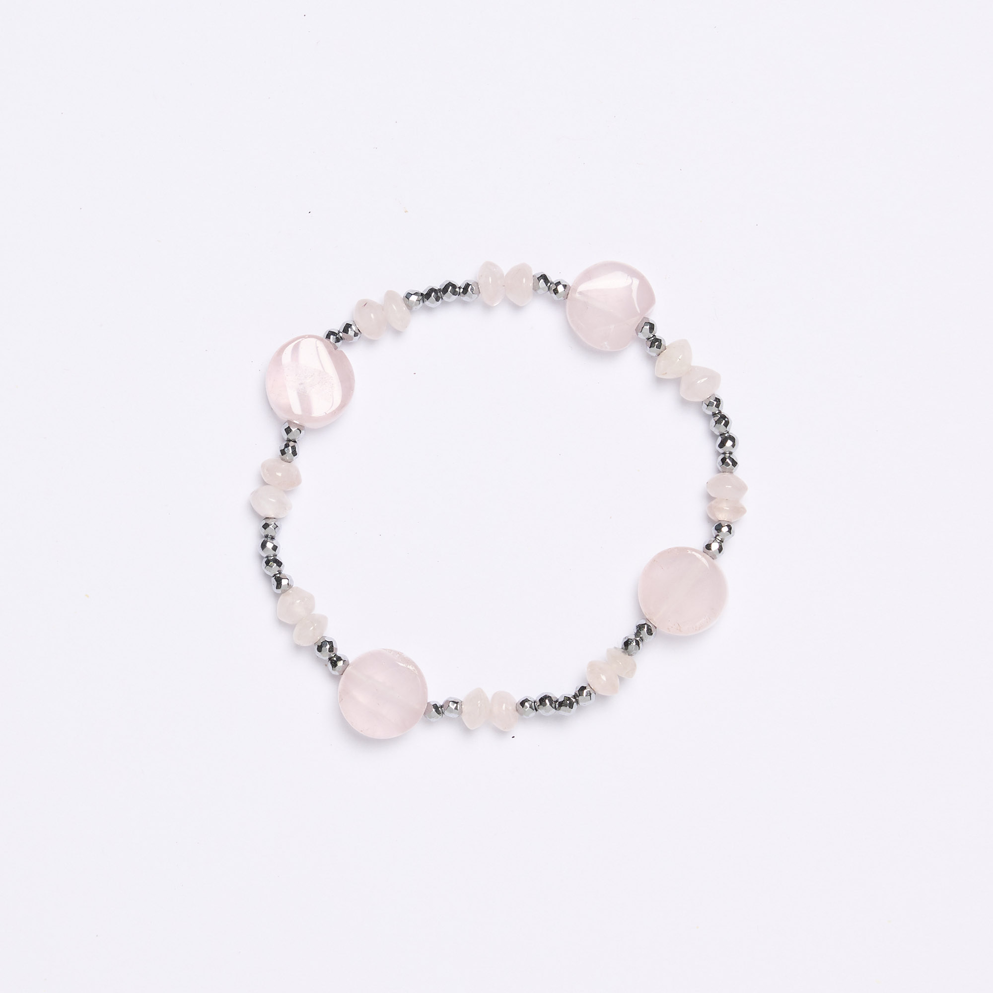 Bracciale infilato con Elastico in Ematite rodiata e Quarzo Rosa a rondelle e forme piatte. Realizzato in Italia.
