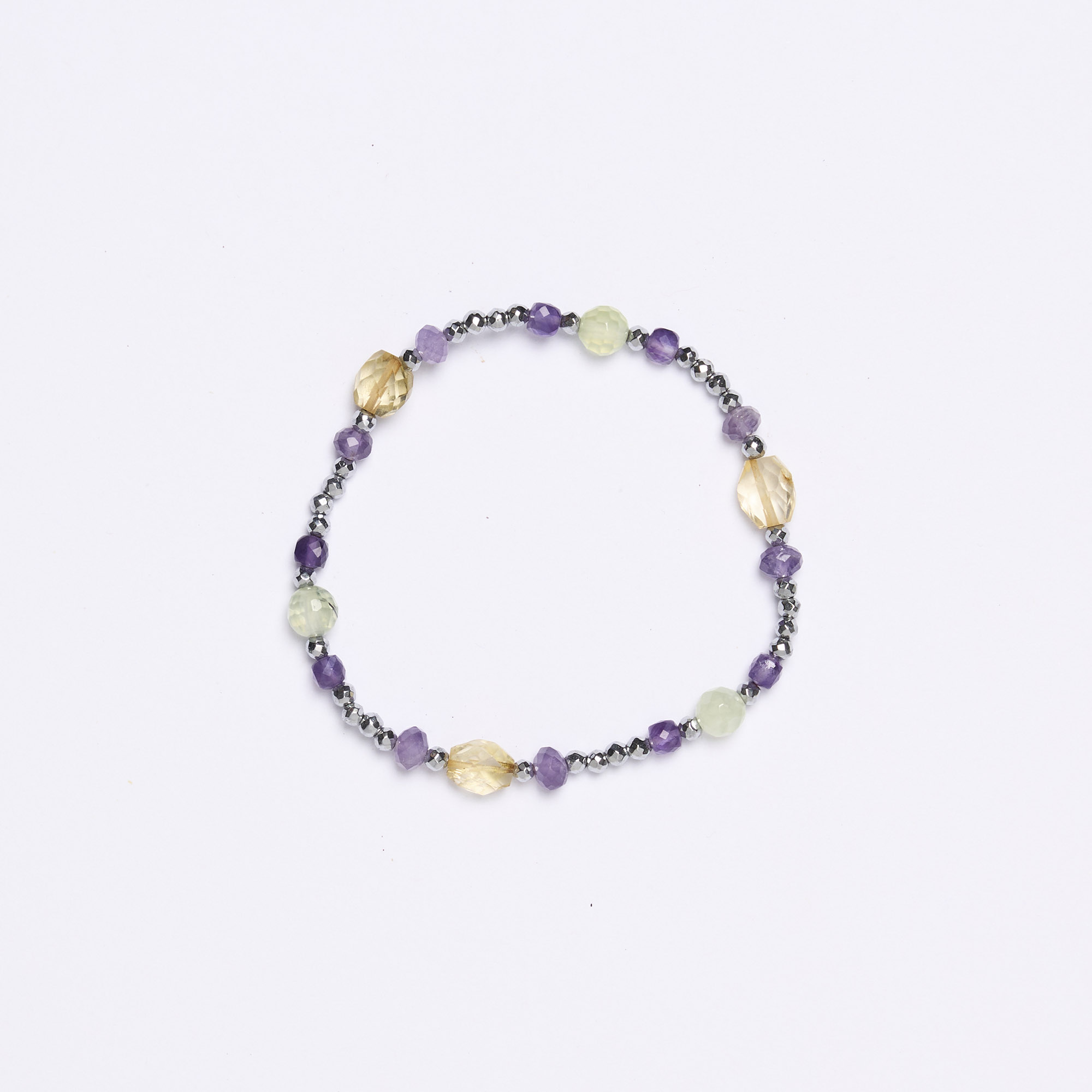 Bracciale infilato con Elastico in Ematite rodiata, con Prehnite, Citrino ed Ametista in forme assortite. Realizzato in Italia.