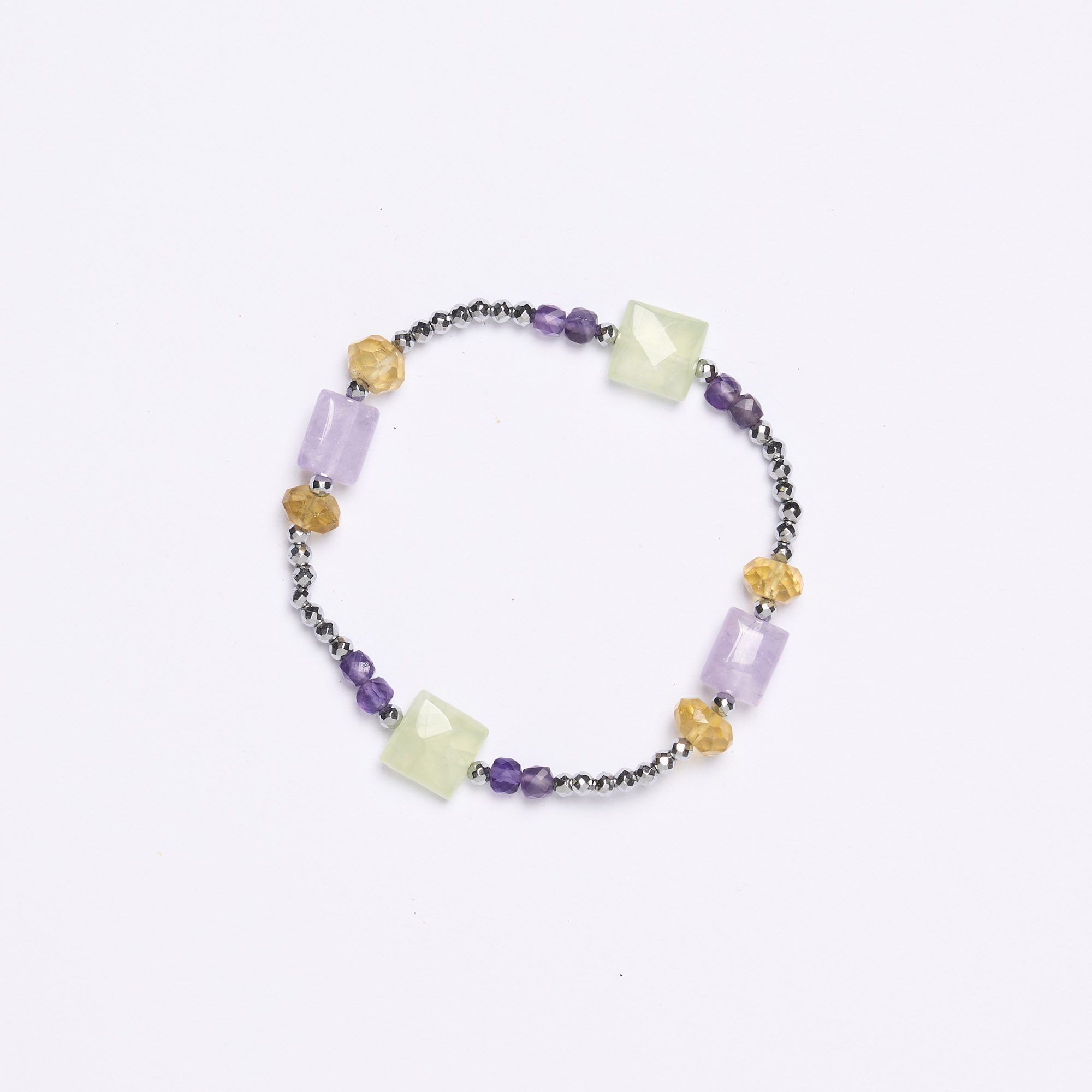 Bracciale infilato con Elastico in Ematite rodiata, con Prehnite, Citrino ed Ametista in forme assortite. Realizzato in Italia.