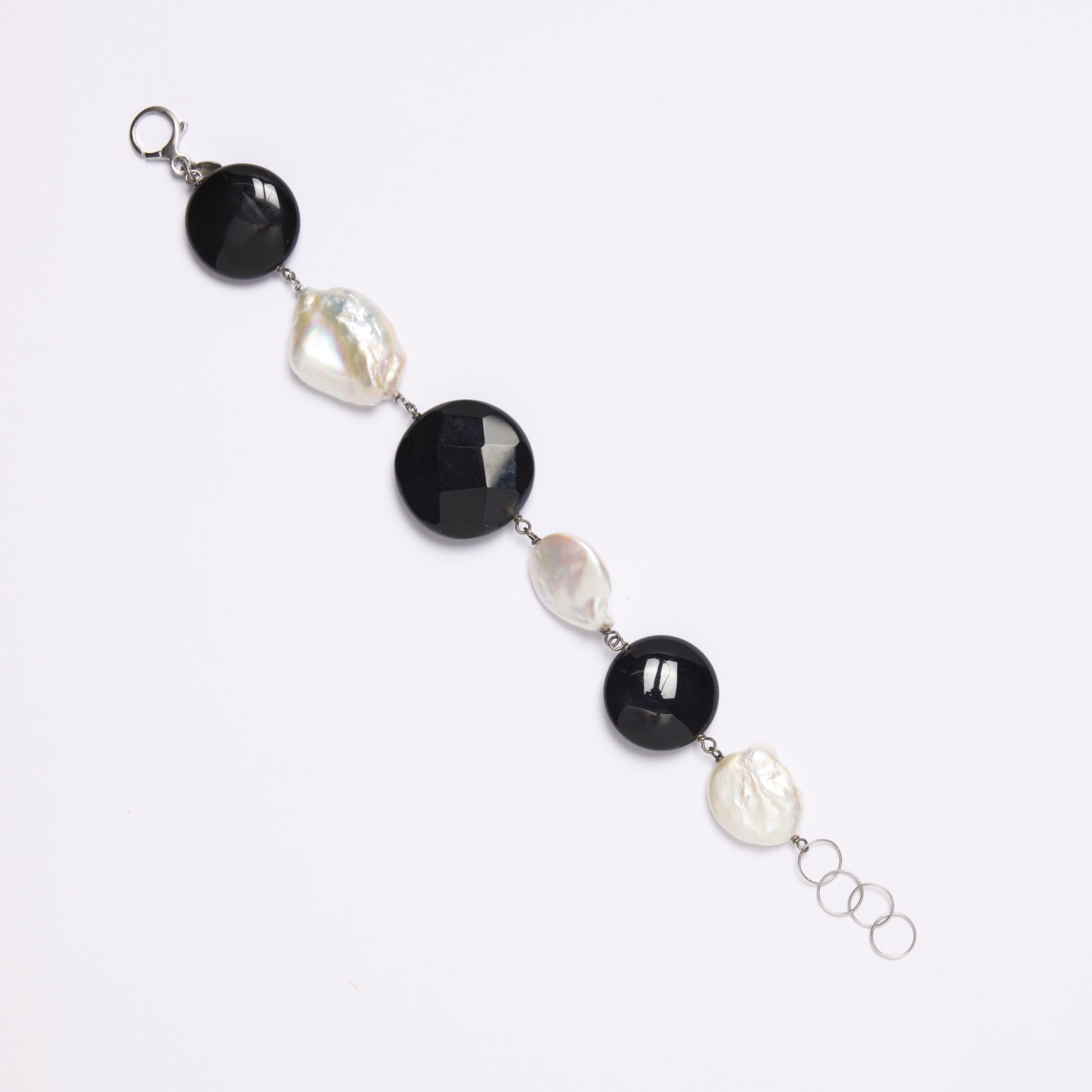 Bracciale in Agata Nera a forme piatte e Perle Barocche piatte. Chiusura in argento 925‰ rodiato. Realizzato in Italia.