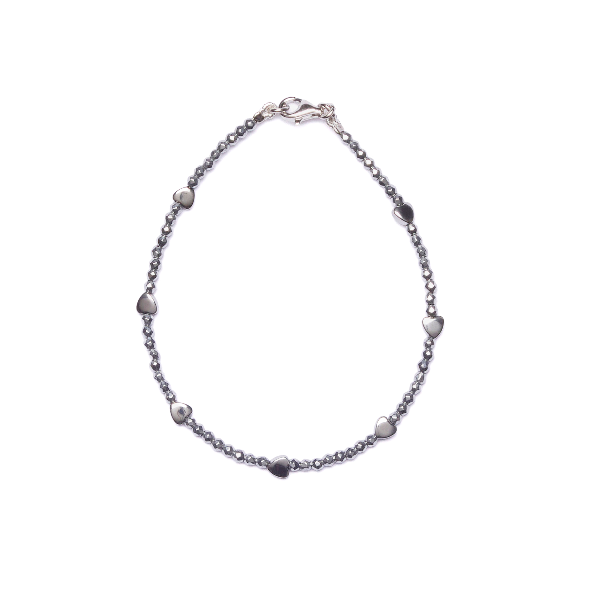 Bracciale infilato in Ematite Rodiata, con elementi a Cuore in Ematite rodiata. Chiusura in Argento 925‰ rodiato. Realizzata in Italia.