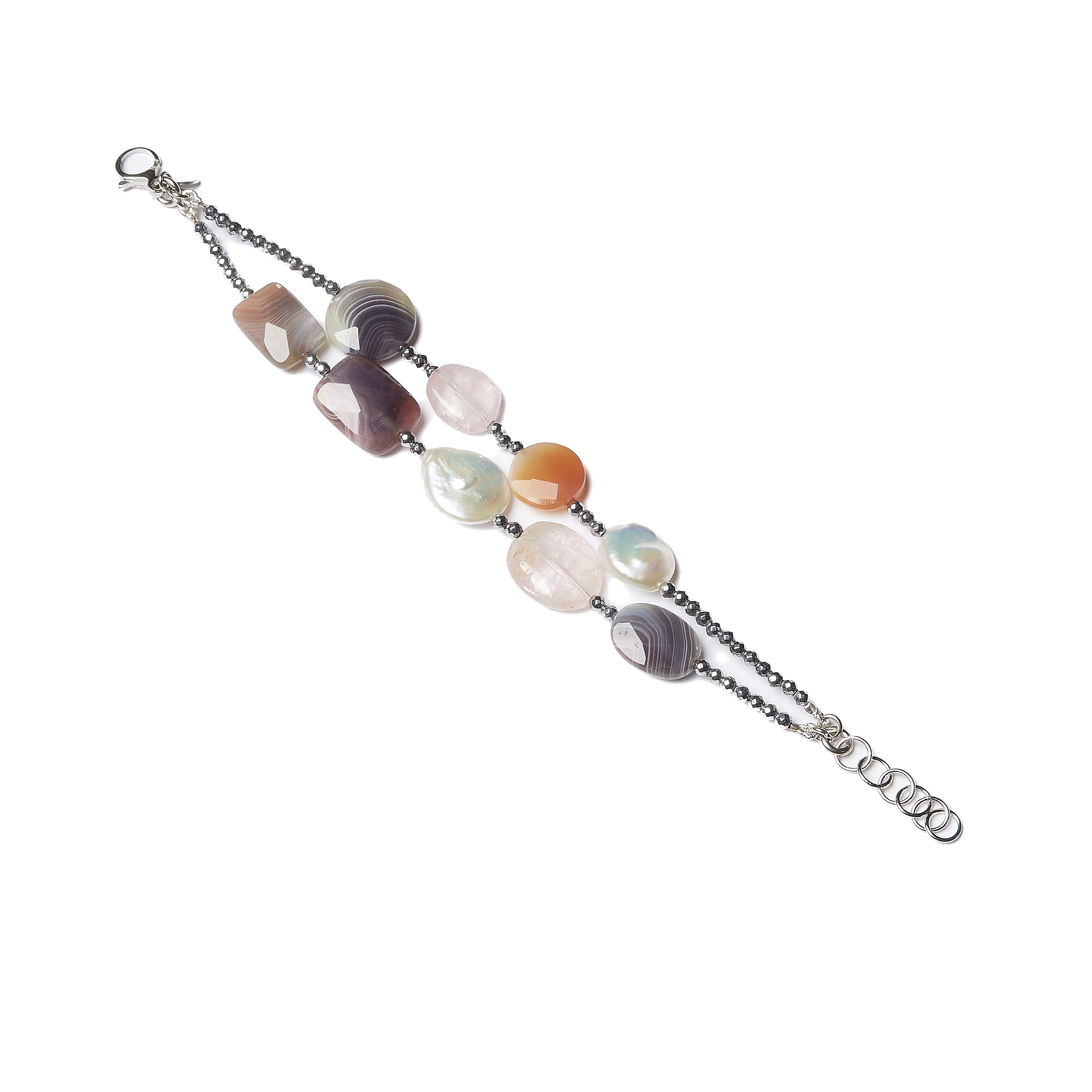 Bracciale in Morganite ed Agata Botswana, con Perle di fiume ed Ematite rodiata. Chiusura in argento 925‰ rodiato. Realizzata in Italia.