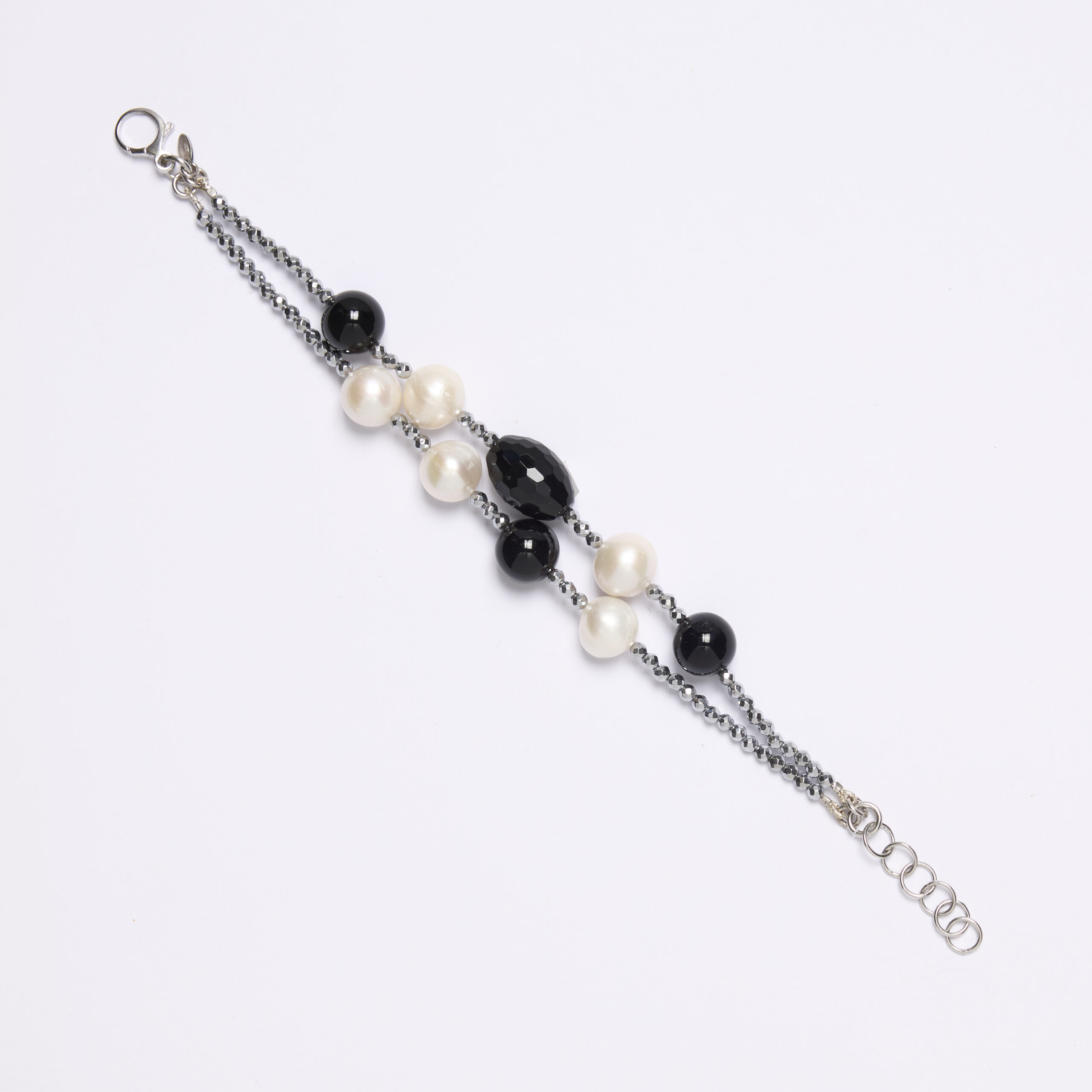 Bracciale infilato a due fili in Agata Nera con Perle d’acqua dolce ed Ematite rodiata. Chiusura in argento 925‰ rodiato. Realizzato in Italia.