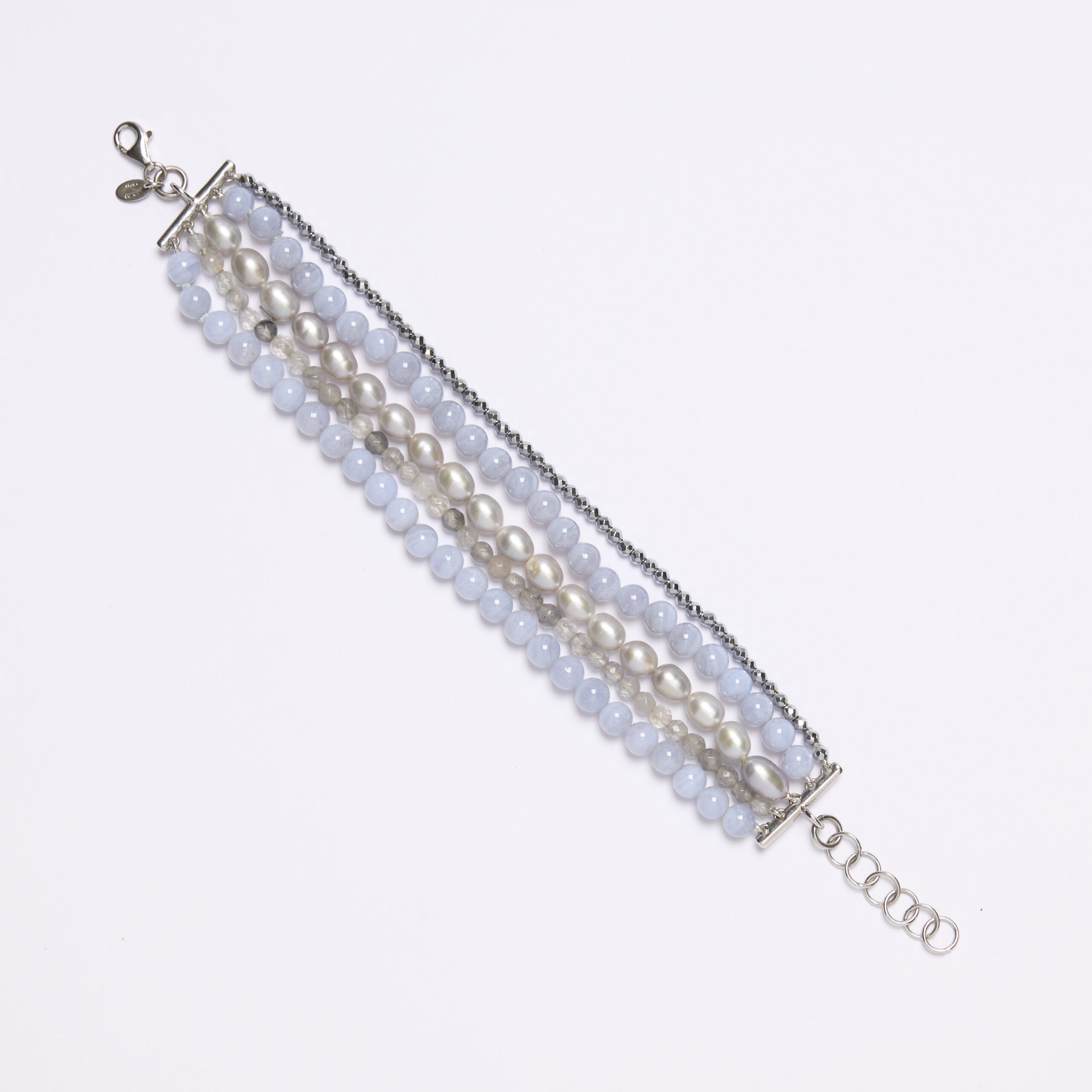 Bracciale infilato a cinque fili in Calcedonio e Quarzo Grigio, con perle d’acqua dolce grigie ed Ematite rodiata. Chiusura in argento 925‰ rodiato. Realizzato in Italia.
