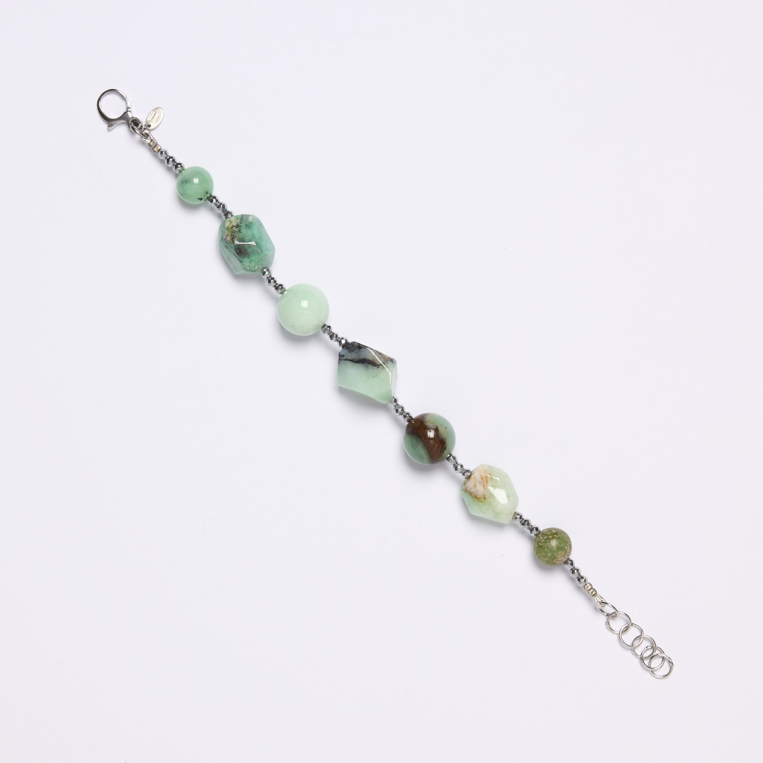 Bracciale infilato in Crisoprasio a sfera liscia e sasso sfaccettato, con Ematite rodiata. Chiusura in argento 925‰ rodiato. Realizzata in Italia.