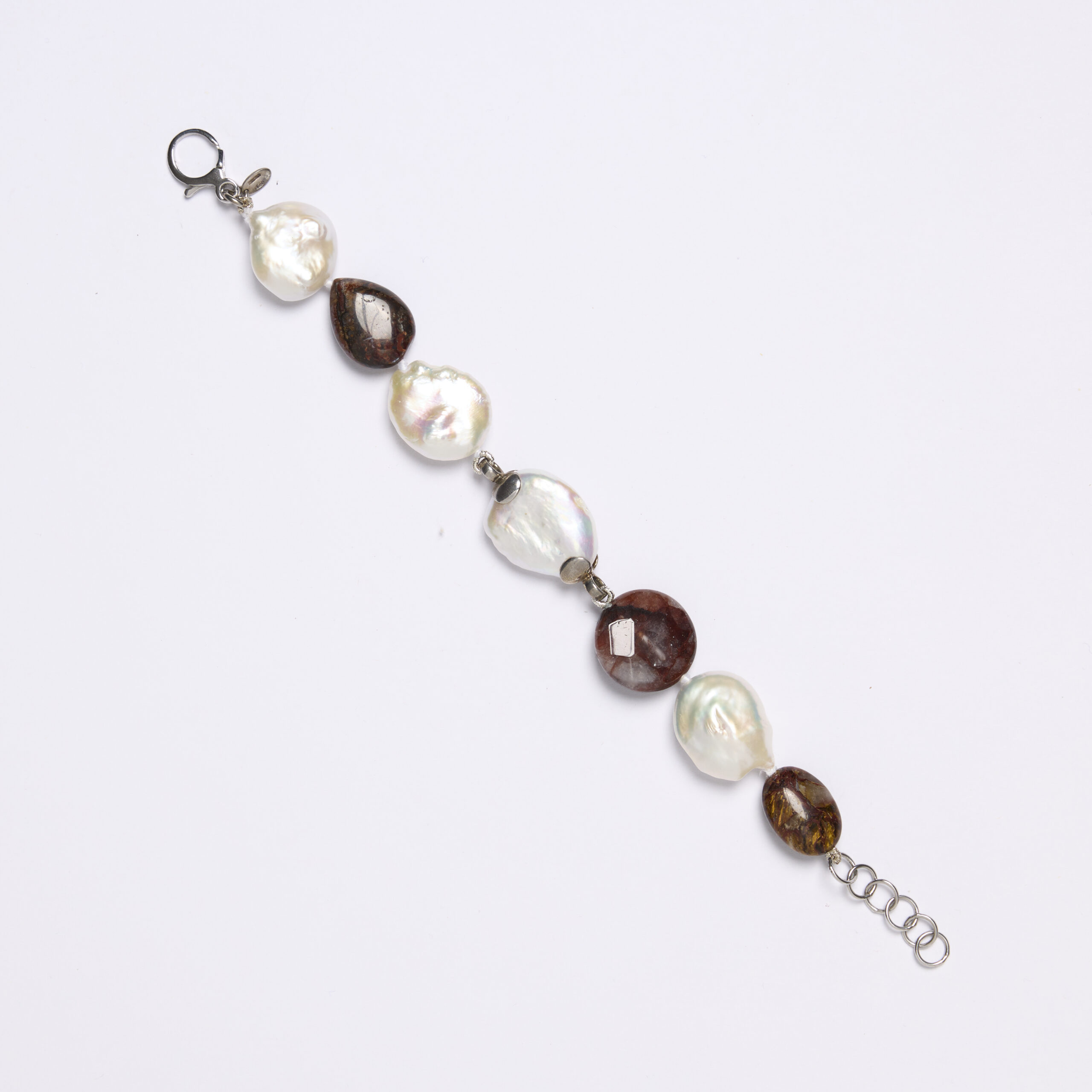 Bracciale infilato in Perle, Quarzo Ematoide e Pietersite. Elementi e chiusura in argento 925‰ rodiato. Realizzato in Italia.