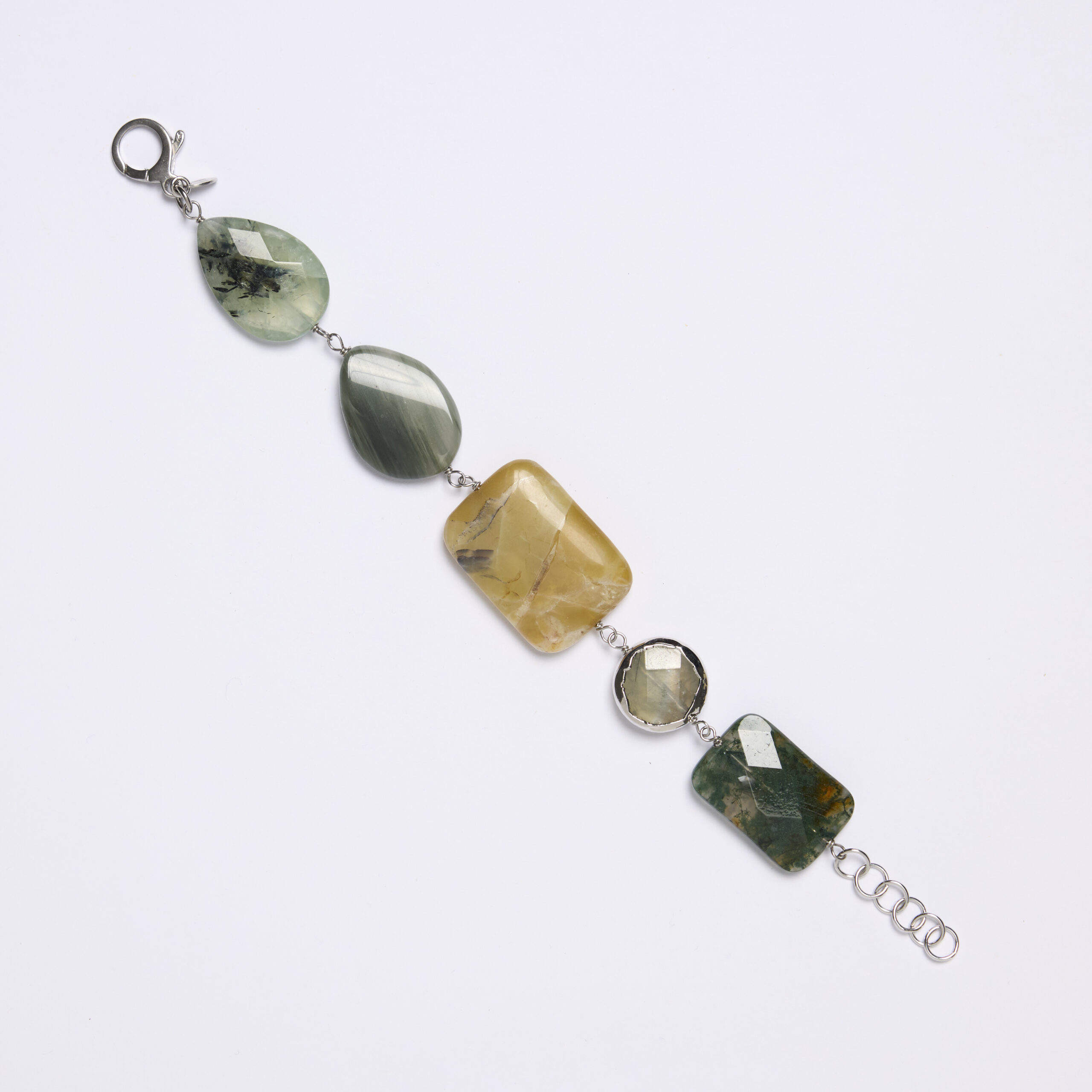 Bracciale rilegato in Agata Salvia, Agata Muschiata, Opale gialla e Prehnite Scontornata in lega Esclusiva rodiata. Chiusura in argento 925‰ rodiato. Realizzata in Italia.