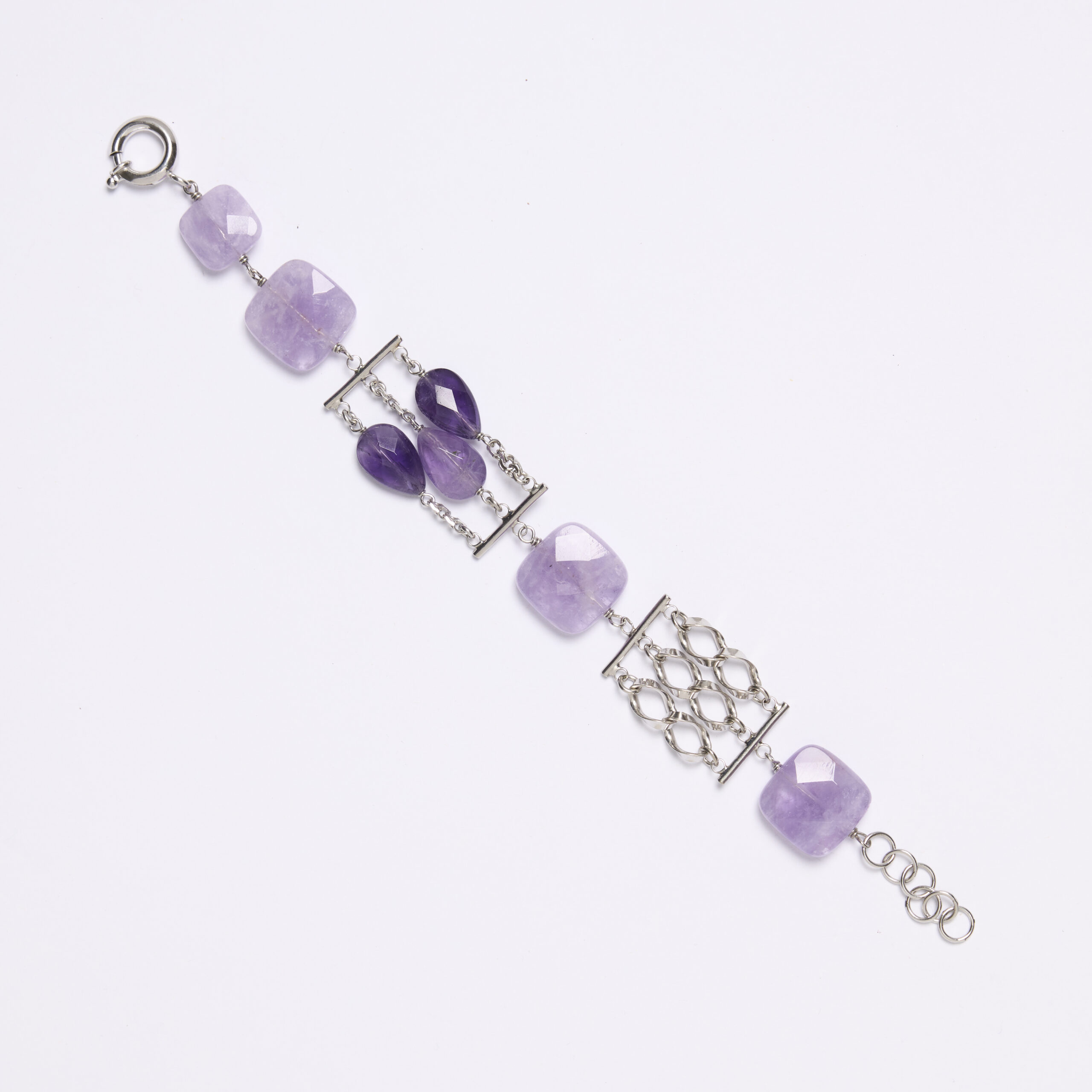 Bracciale rilegato in Ametista con sezioni rilegate in Argento a tre fili. Chiusura in argento 925‰ rodiato. Realizzato in Italia.