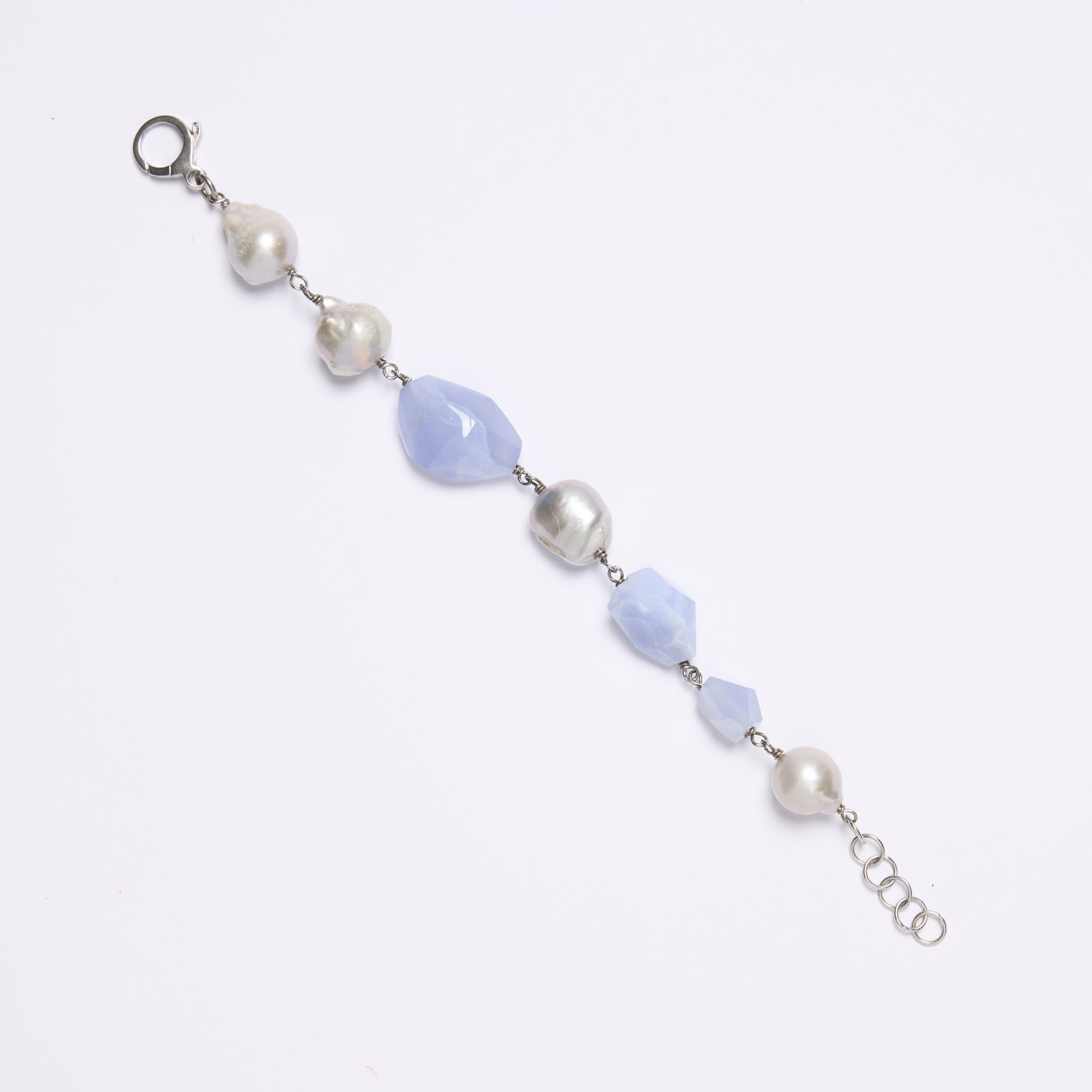 Bracciale rilegato in Calcedonio e Perle barocche d’acqua dolce. Chiusura in argento 925‰ rodiato. Realizzato in Italia.
