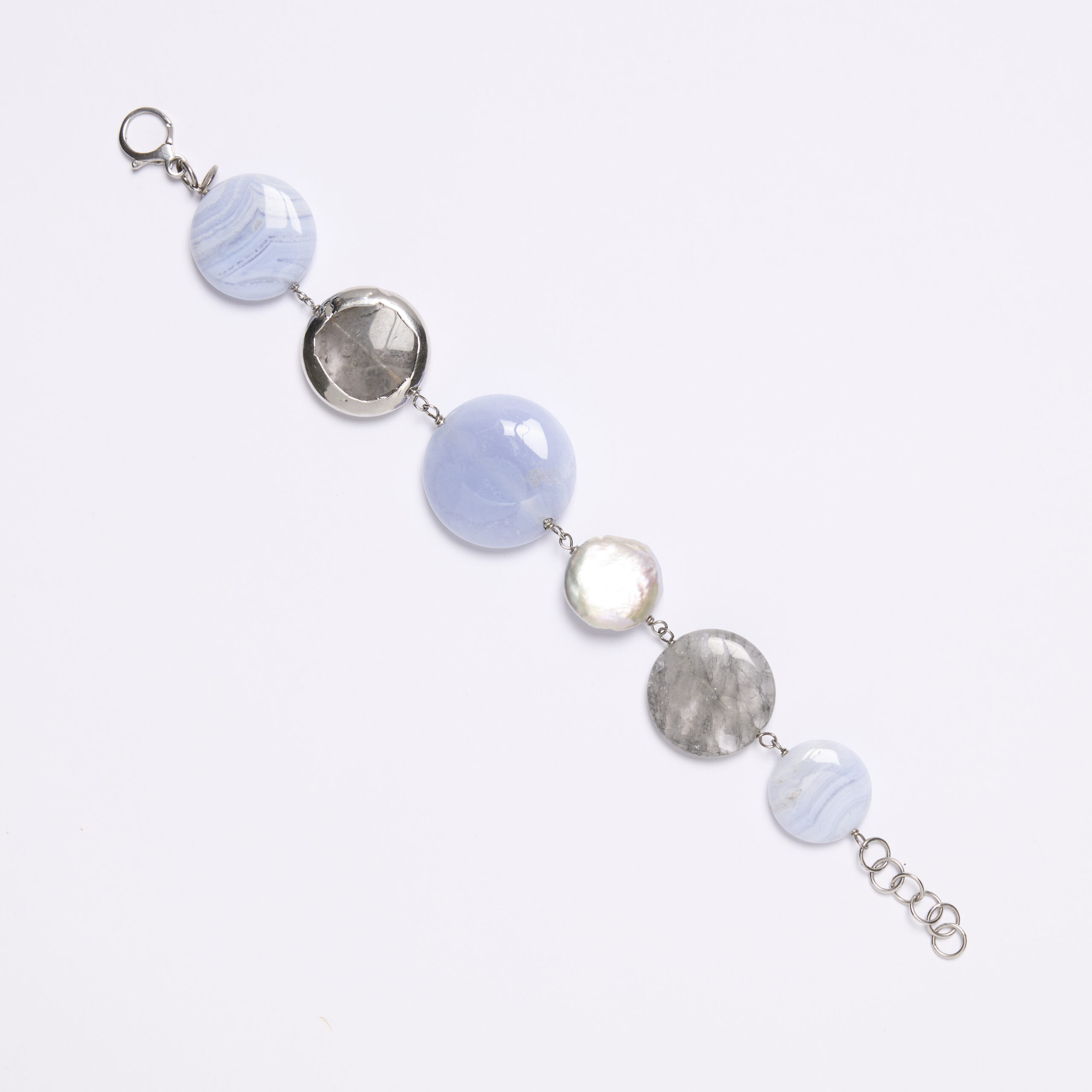 Bracciale rilegato in Calcedonio, perla piatta e Quarzo Grigio, con elemento Scontornato in lega esclusiva rodiata. Chiusura in argento 925‰ rodiato. Realizzato in Italia.
