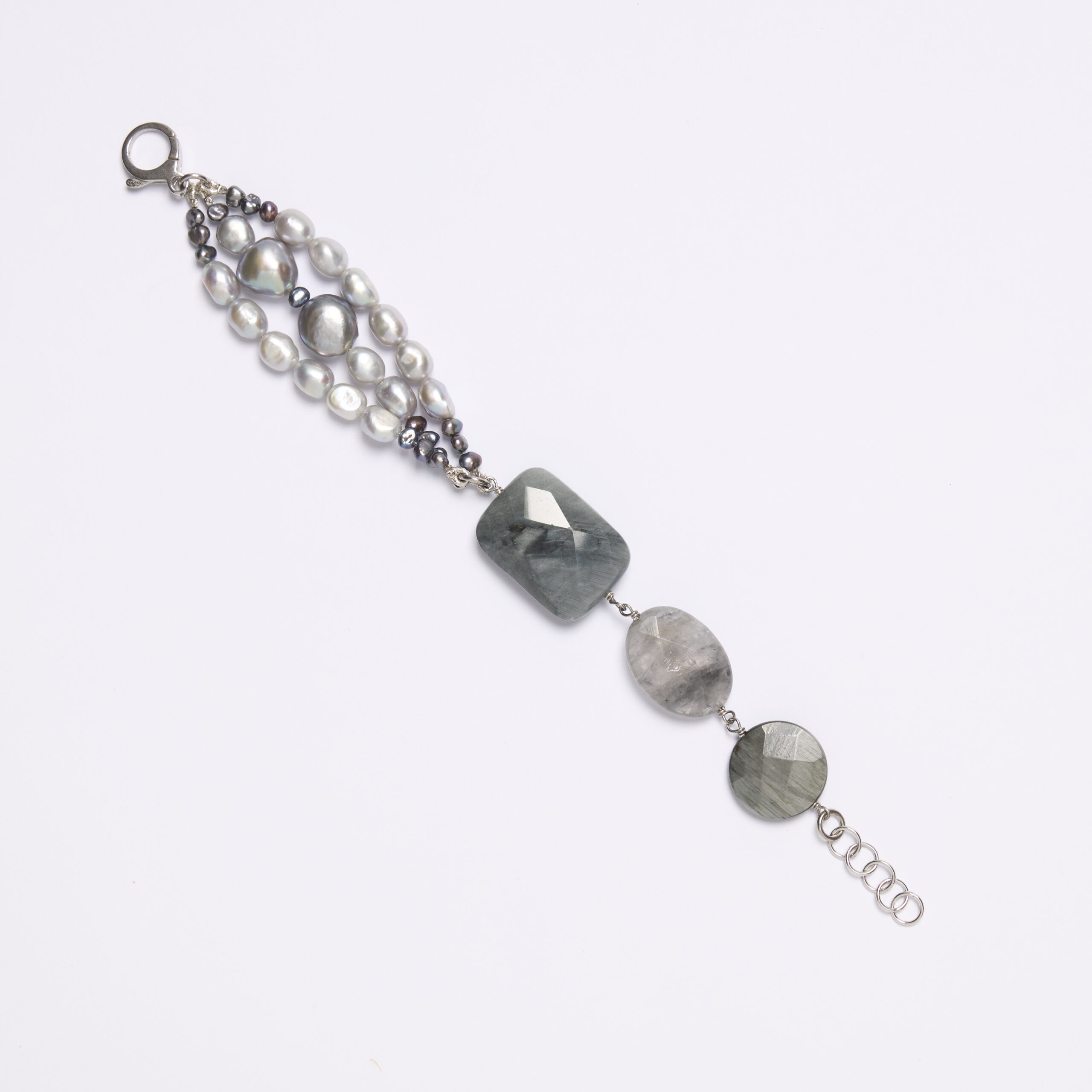 Bracciale rilegato in Occhio di Gatto e Quarzo Grigio a forme sfaccettate e sezione a tre fili in Perle d’acqua dolce. Chiusura in argento 925‰ rodiato. Realizzato in Italia.