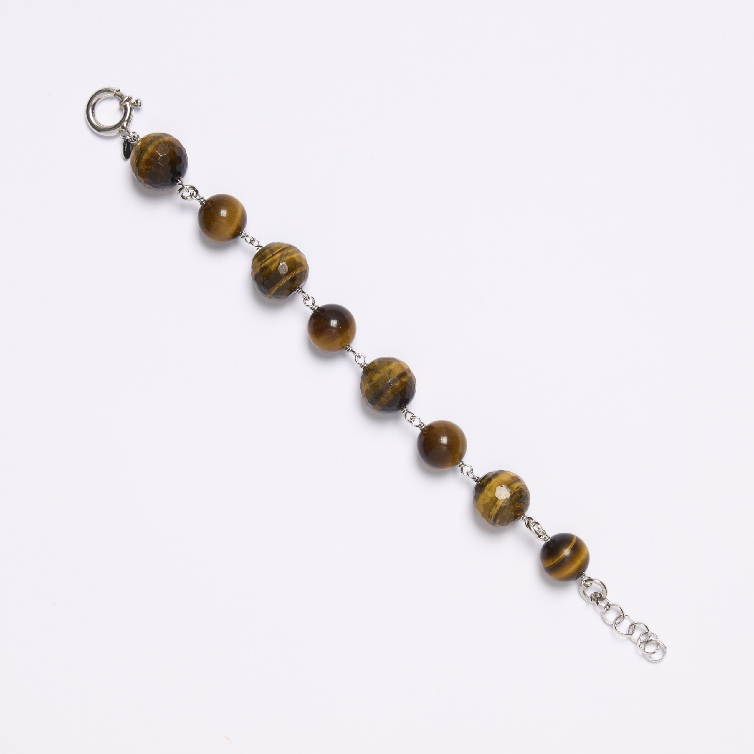 Bracciale rilegato in Occhio di Tigre a sfera liscia e sfaccettata. Chiusura in Argento 925‰ rodiato. Realizzato in Italia.