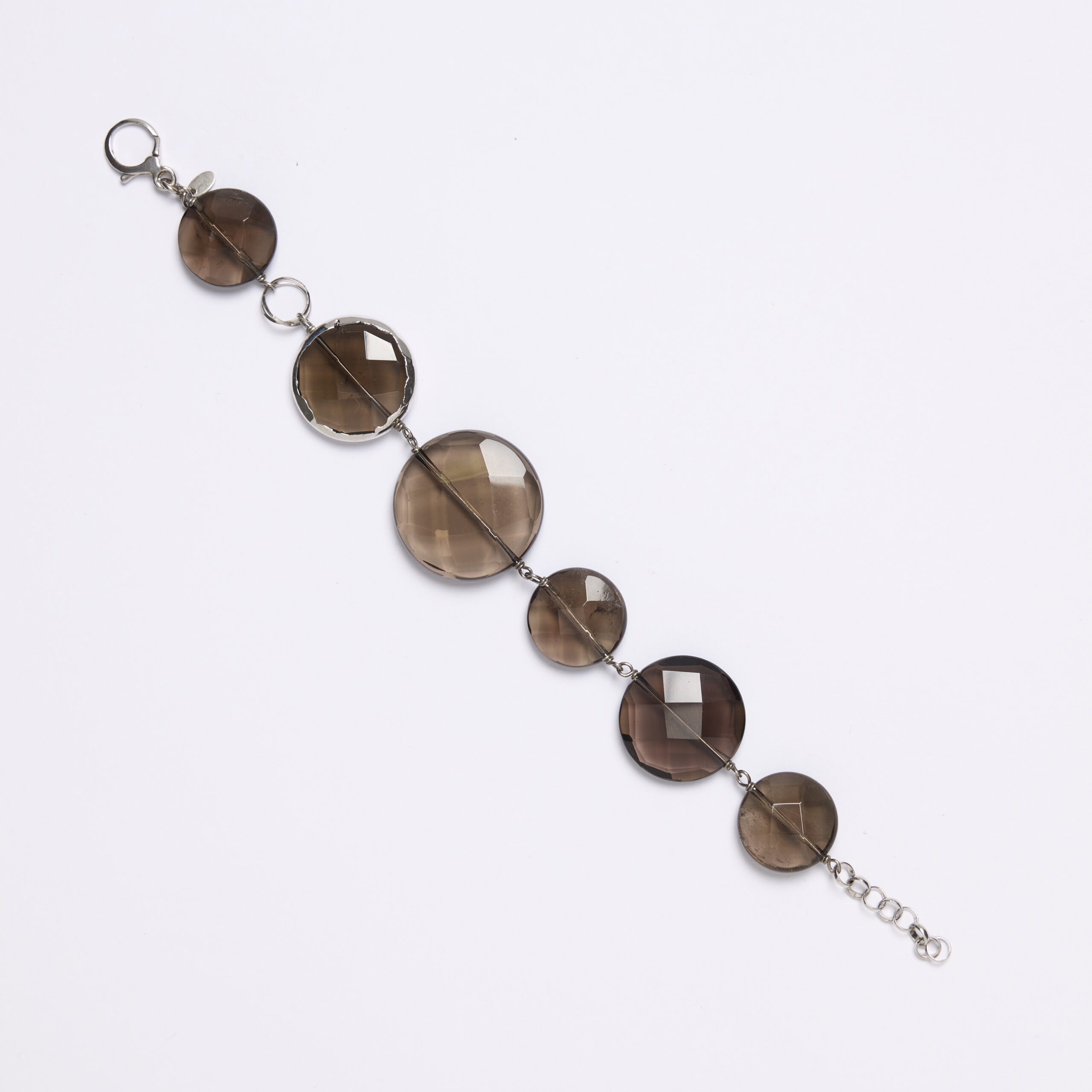 Bracciale rilegato in Quarzo Fumé Scontornato in lega esclusiva rodiata. Chiusura in argento 925‰ rodiato. Realizzato in Italia.