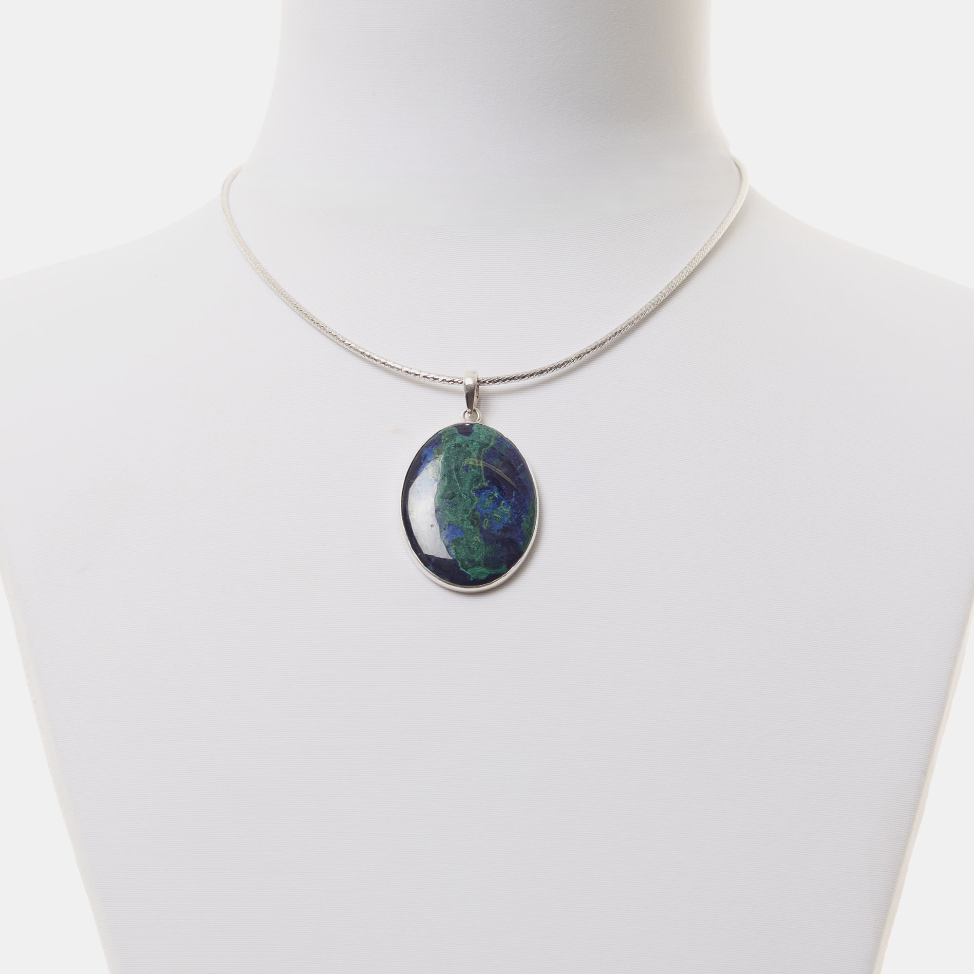 Ciondolo in Azzurrite Malachite montato in argento 925‰, realizzato artigianalmente. Girocollo in argento venduto separatamente.