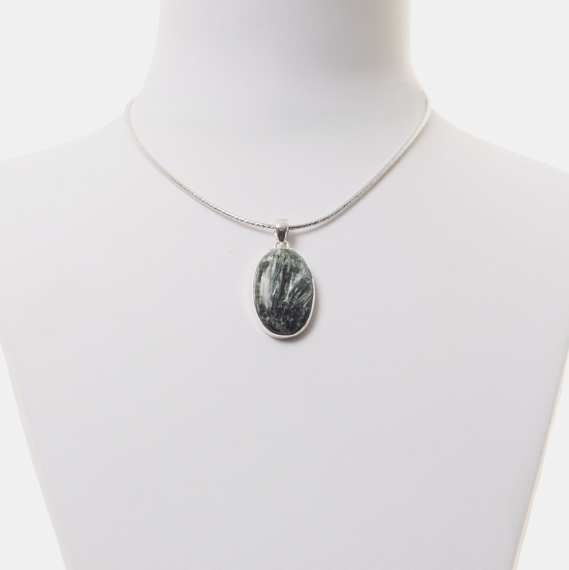 Ciondolo in Serafinite ovale, montato in argento 925‰, realizzato artigianalmente. Girocollo in argento venduto separatamente.