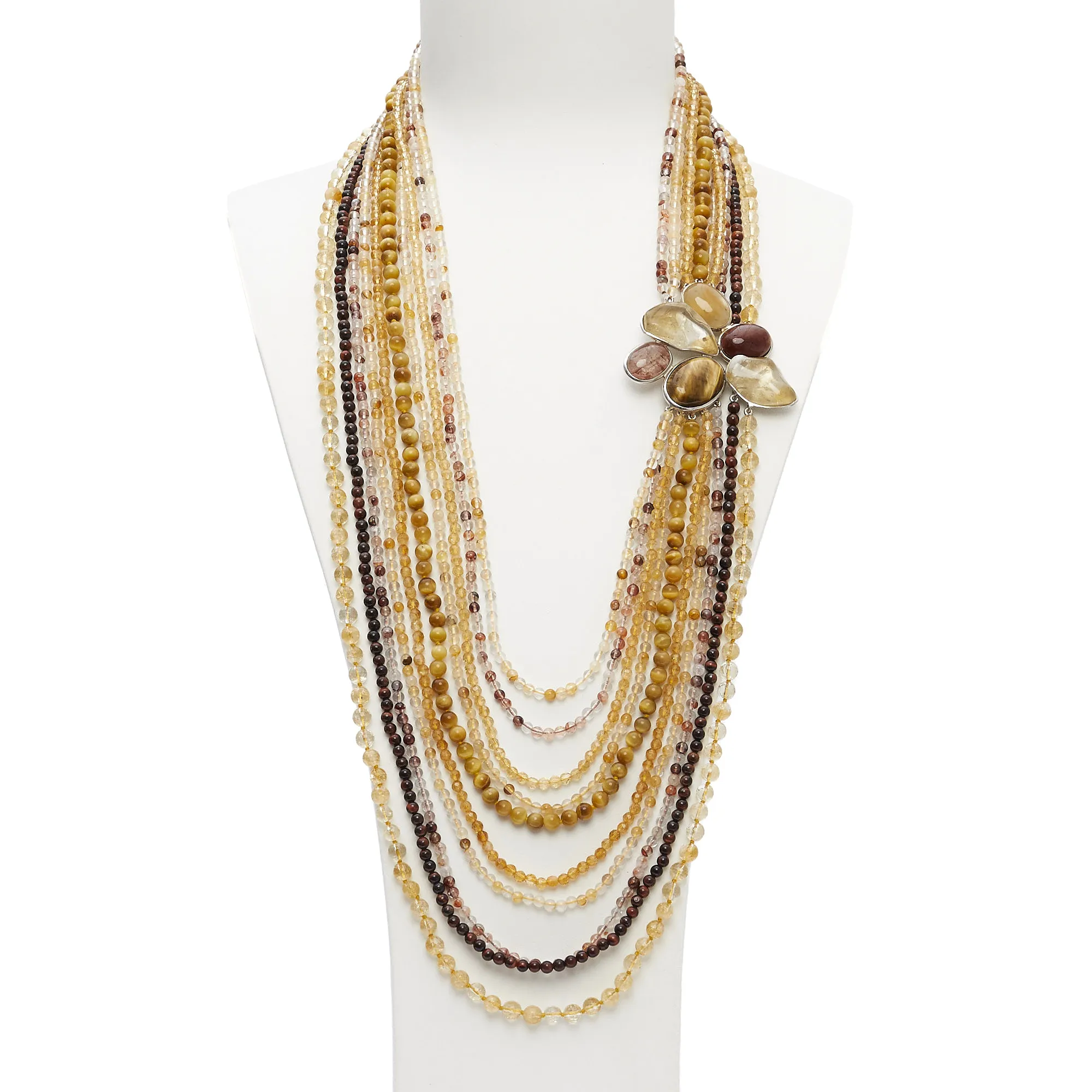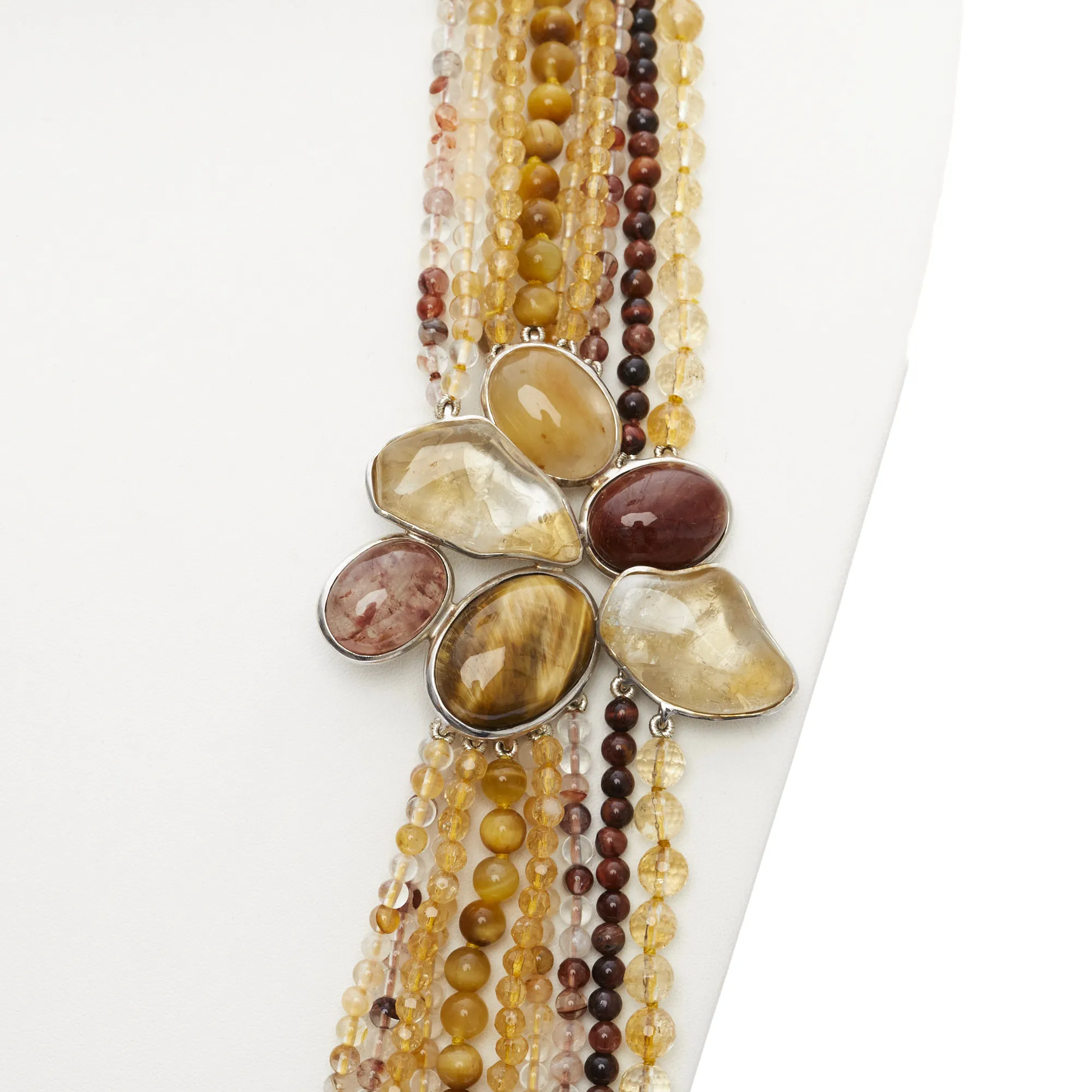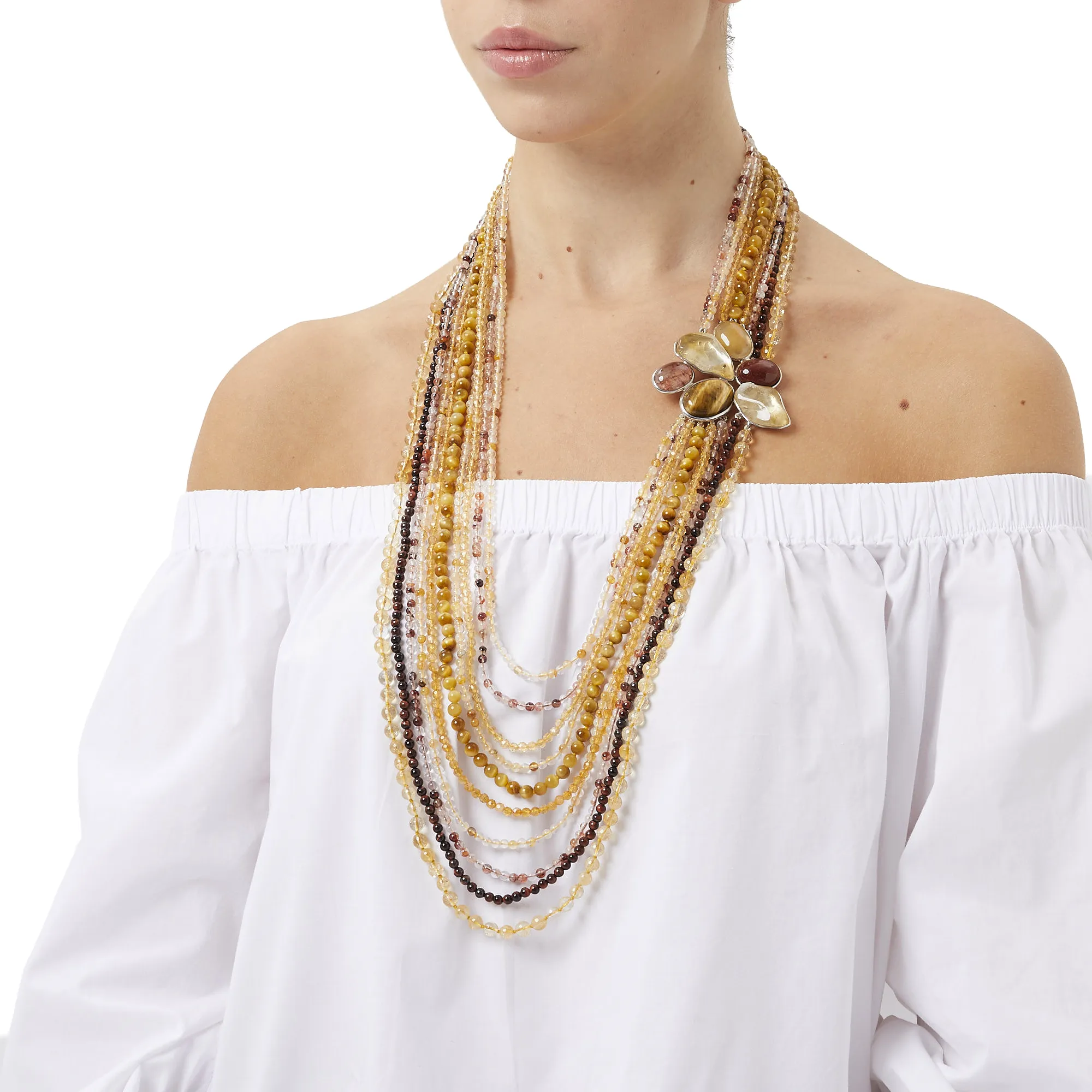 Collana medio lunga infilata a dieci fili, in Citrino, Occhio di Bue, Quarzo Ematoide Giallo e Golden eye, con composizione laterale artigianale in Ematoide, Occhio di Bue, Golden Eye ed Argento 925‰ rodiato. Realizzata in Italia.