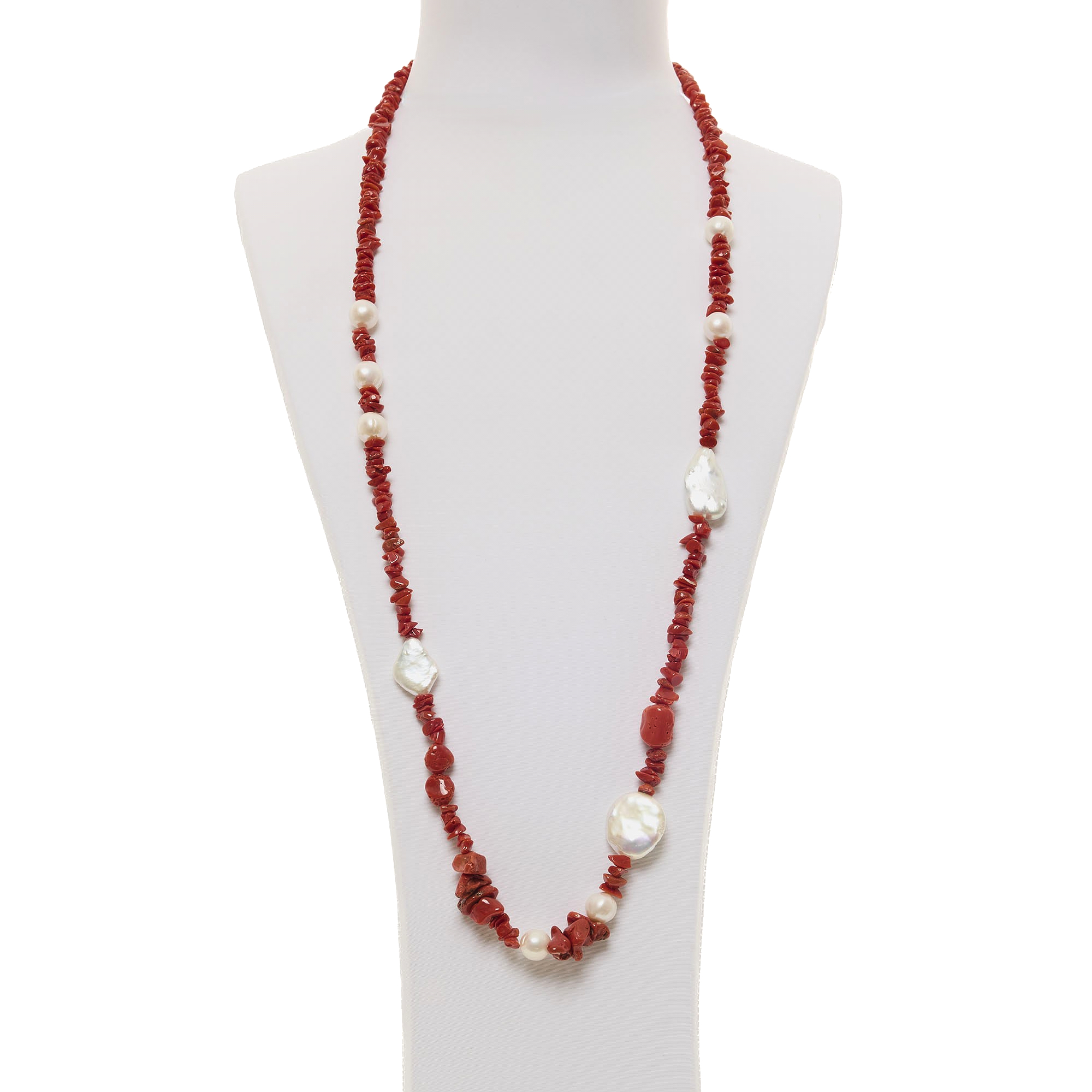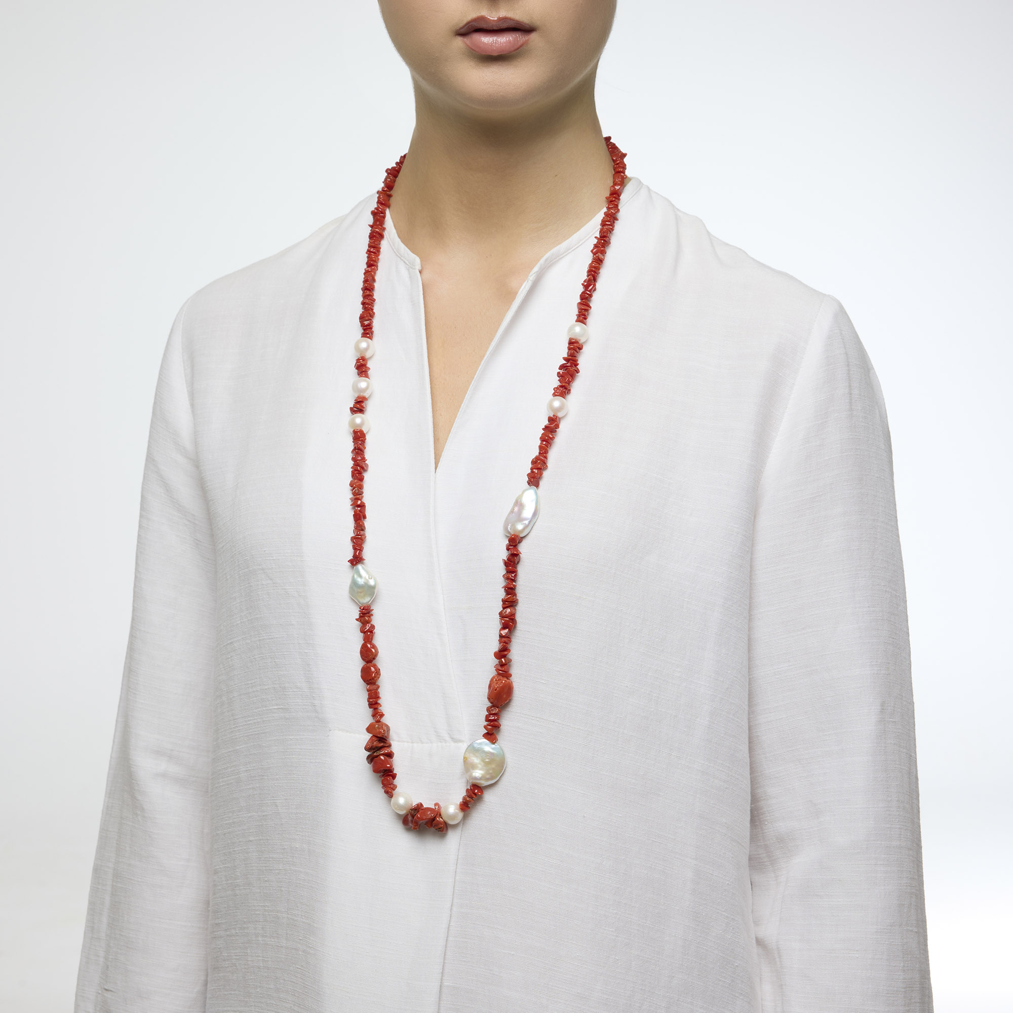 Collana infilata in Corallo rosso e Perle d’acqua dolce piatte e sferiche. Realizzata in Italia.