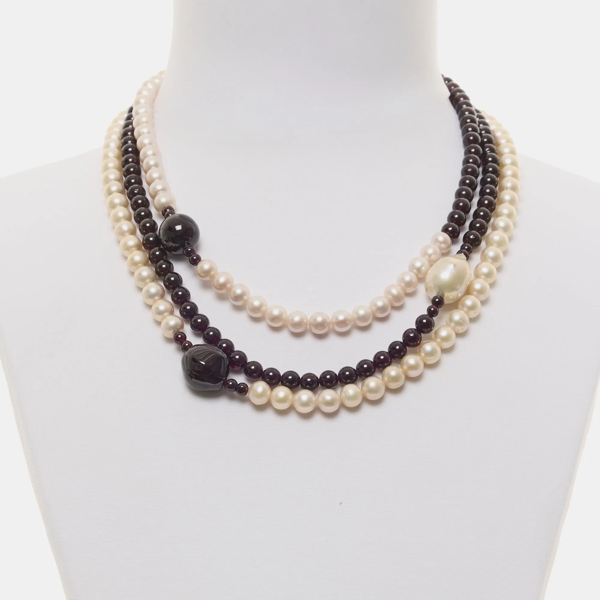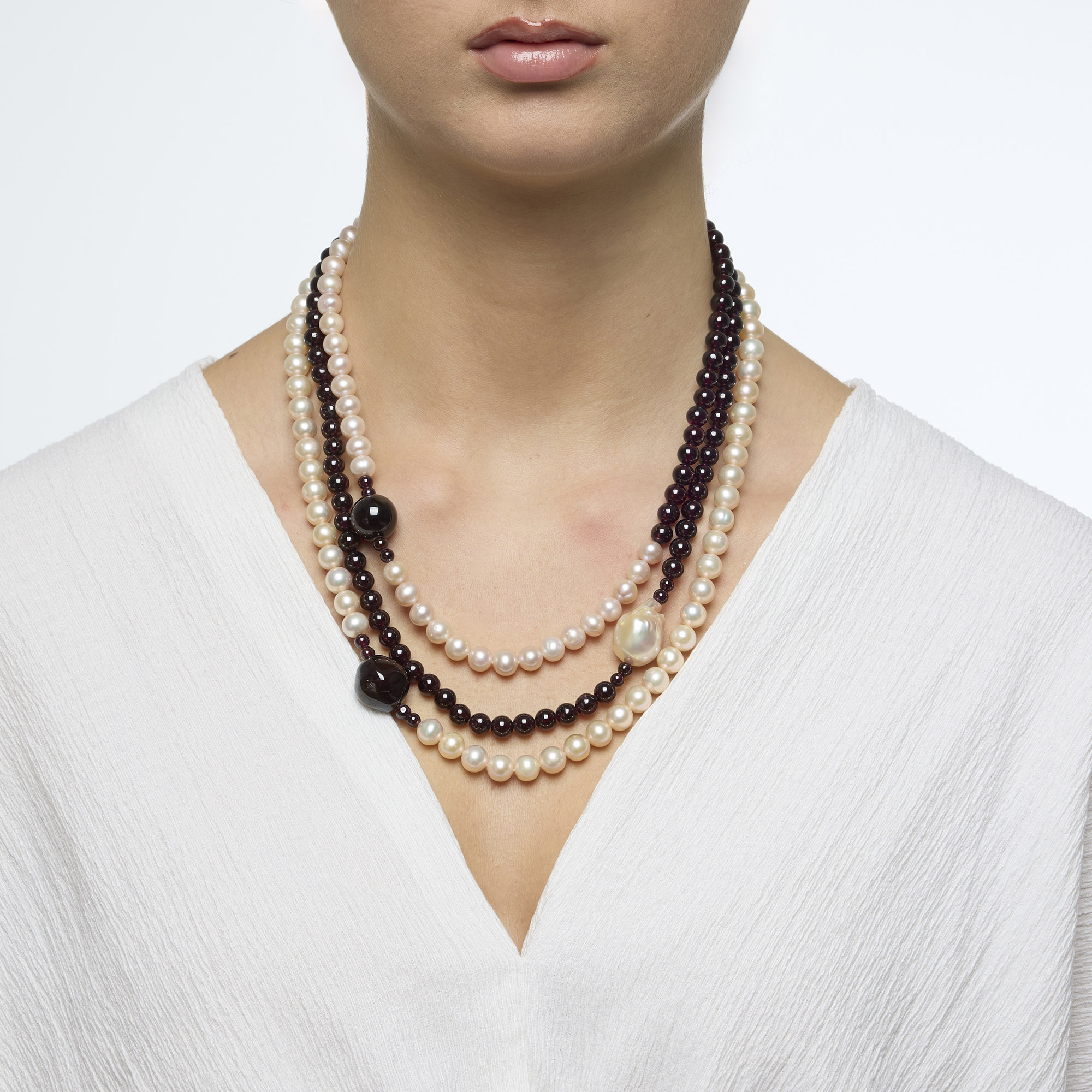 Collana corta a tre fili in Perle di tono leggermente rosato e Granato a sfera liscia e sasso burattato. Chiusura in argento 925‰ rodiato. Realizzata in Italia.