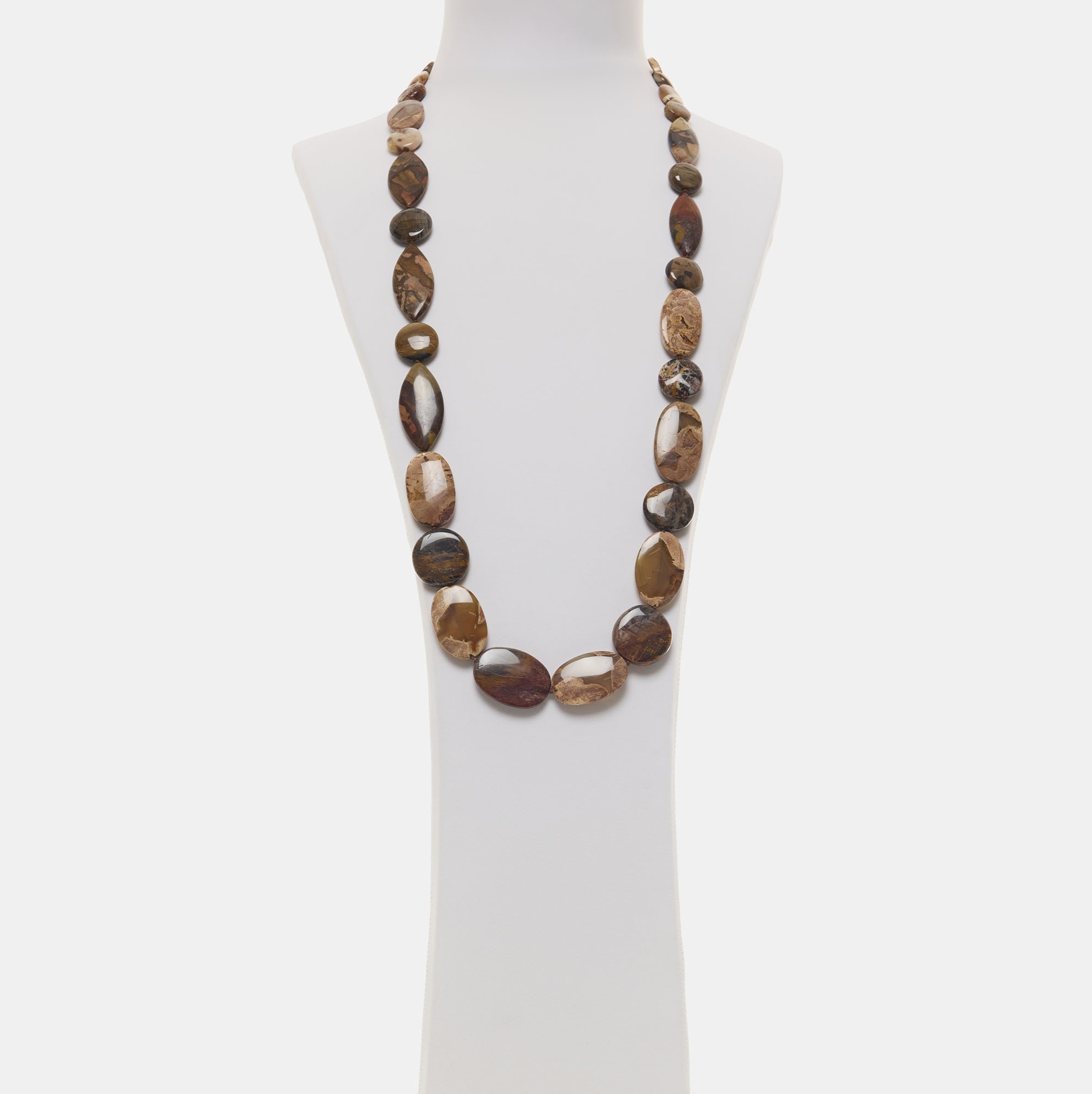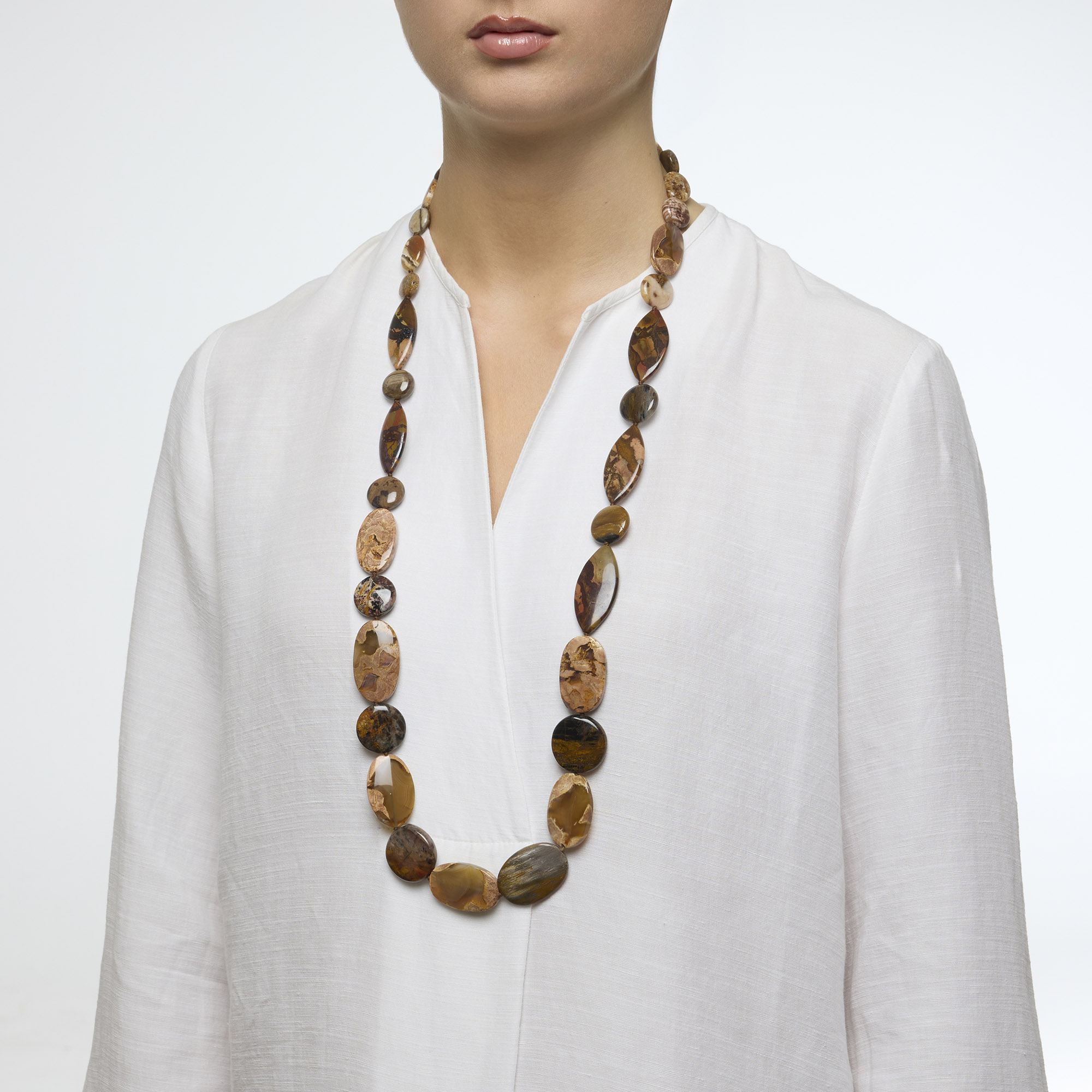 Collana infilata con elementi in Agata, Diaspro Pilbara e Legno Fossile a forme piatte lisce. Chiusura in Argento 925‰ rodiato. Realizzata in Italia.