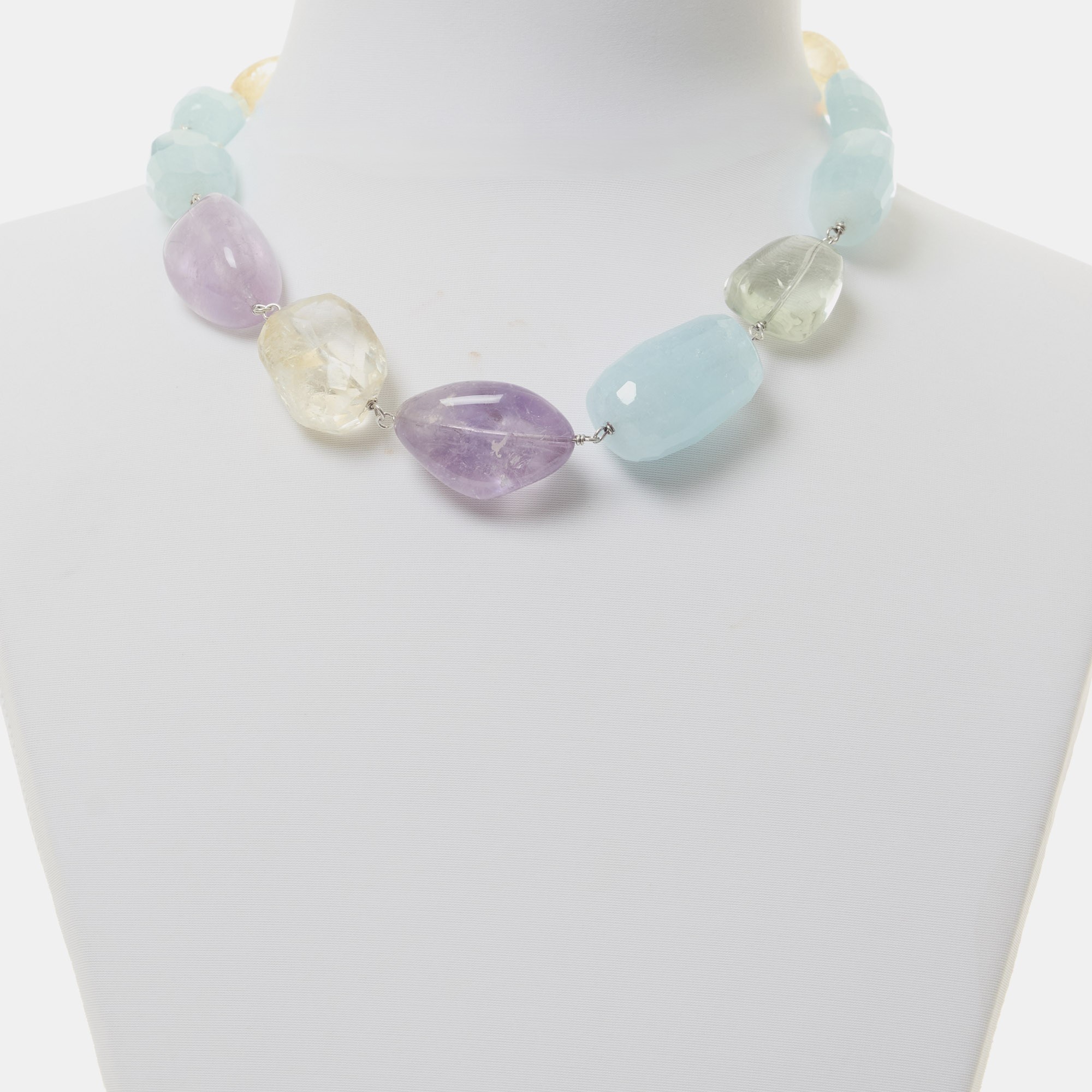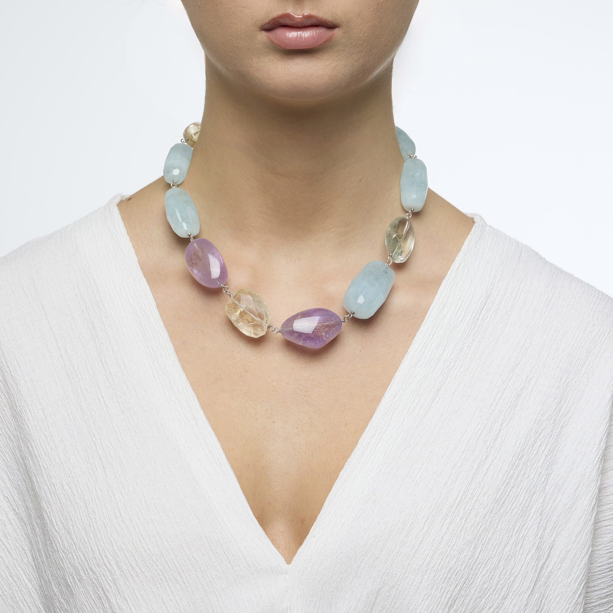 Collana corta rilegata in Acquamarina sfaccettata, Ametista, Citrino e Prasiolite. Chiusura in argento 925‰ rodiato. Realizzata in Italia.