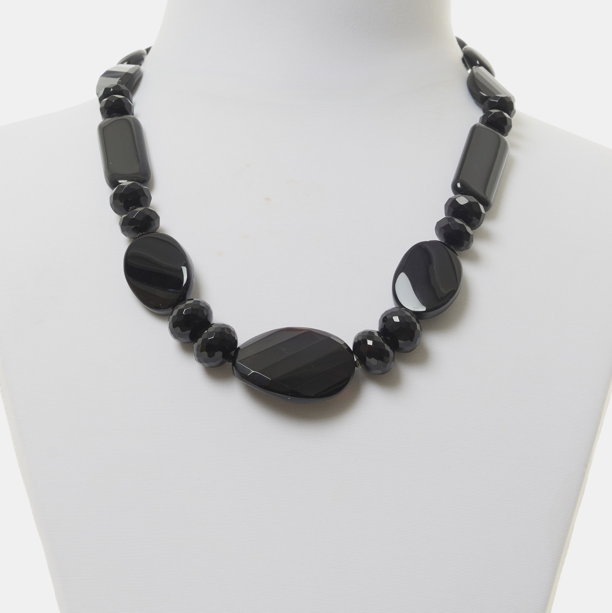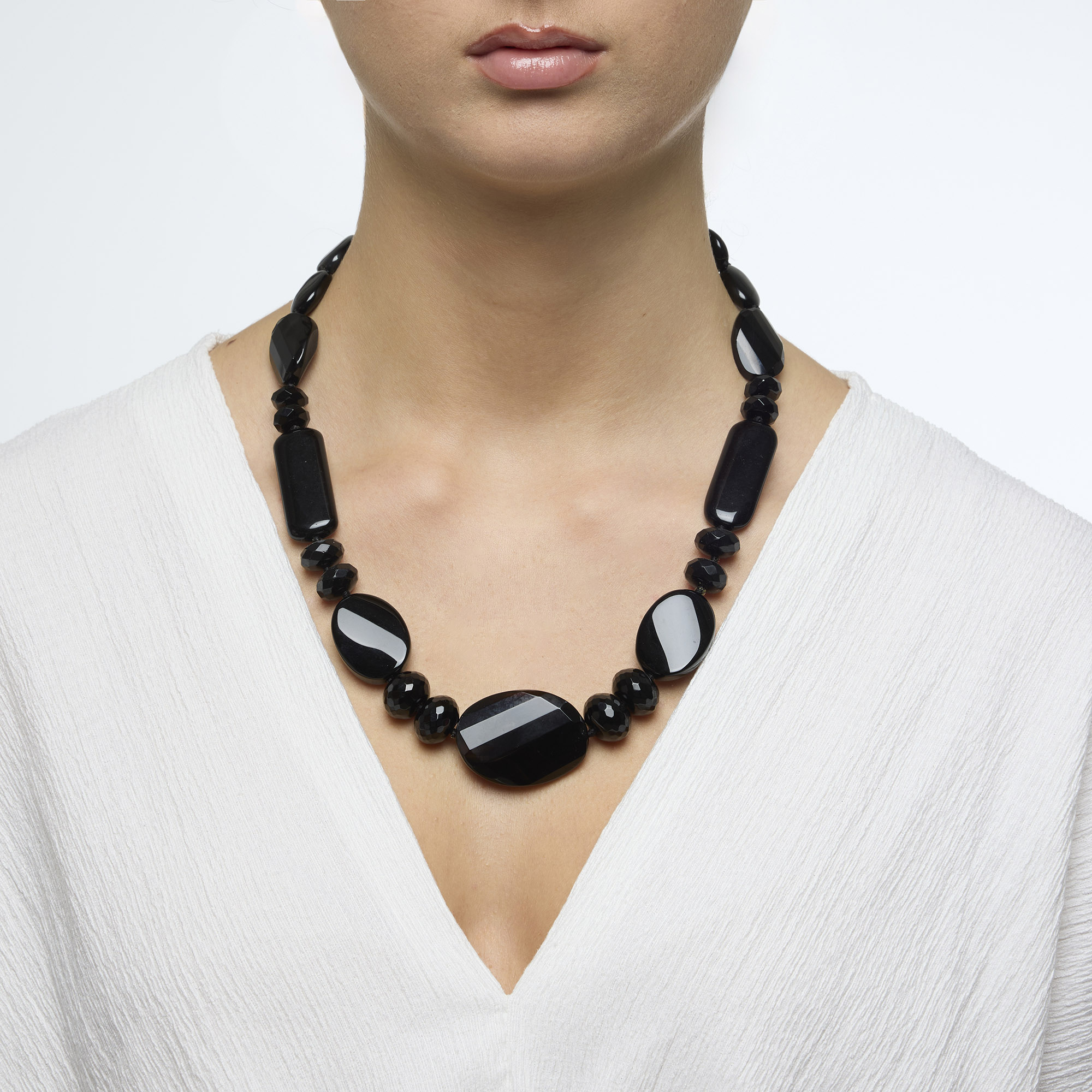 Collana corta infilata in Agata Nera a rondelle forme piatte lisce e sfaccettate. Chiusura in argento 925‰ rodiato. Realizzata in Italia.