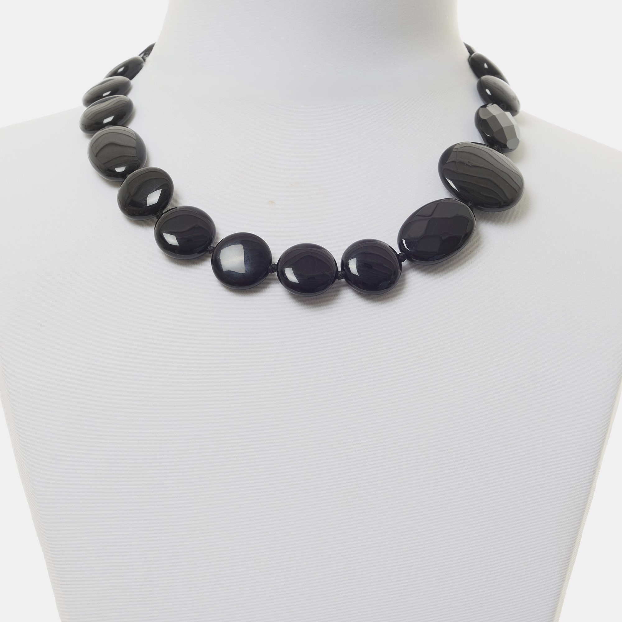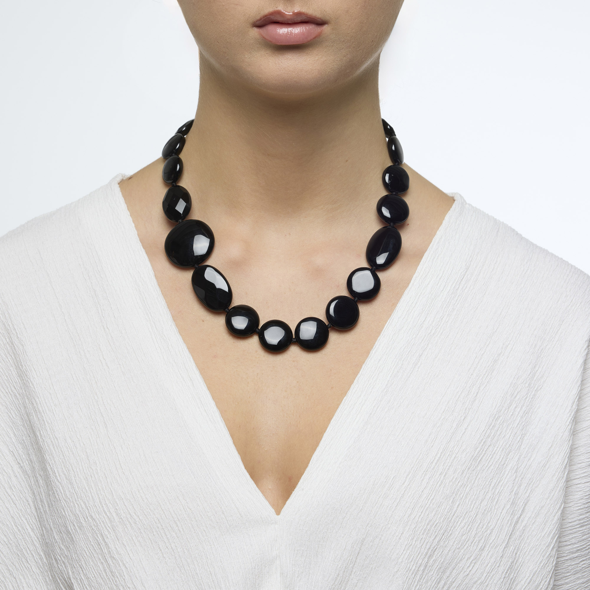 Collana corta infilata in Agata Nera a forme piatte lisce e sfaccettate. Chiusura in argento 925‰ rodiato. Realizzata in Italia.