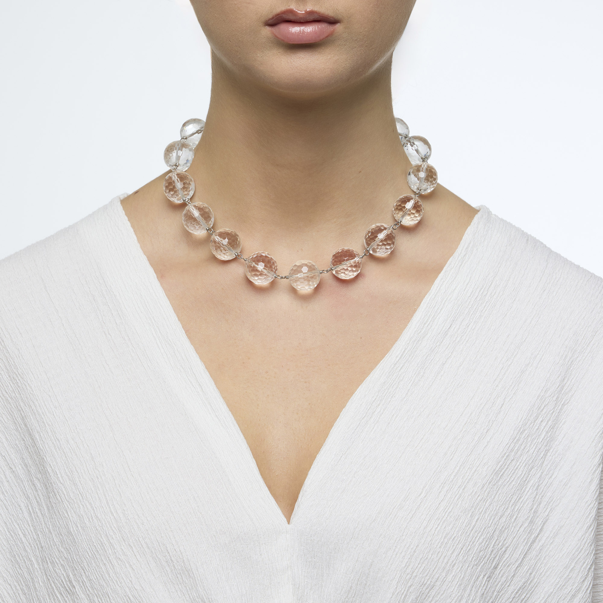 Collana corta in Cristallo di Rocca a sfera sfaccettata, rilegata in Argento. Chiusura in Argento 925‰ rodiato. Realizzata in Italia.