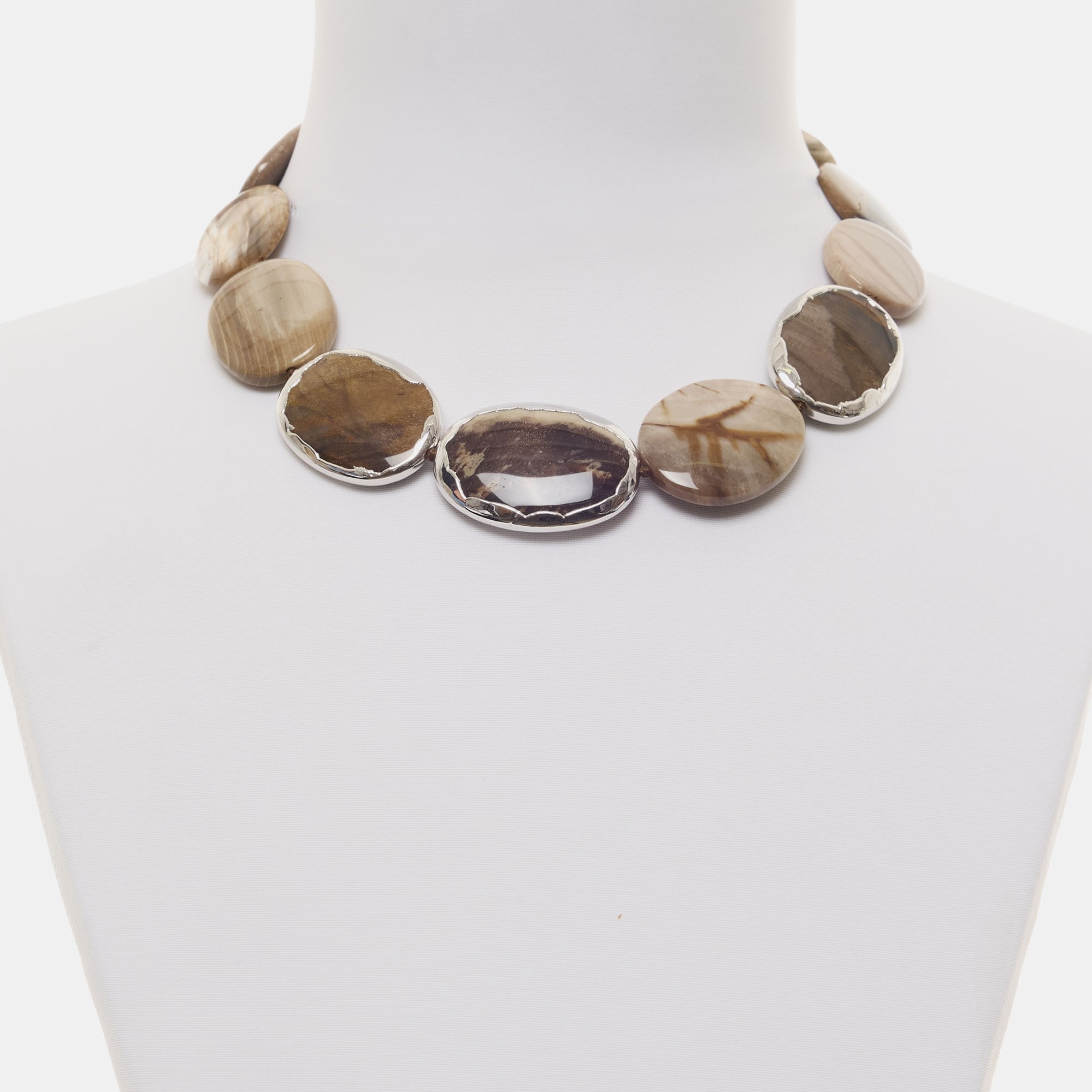 Collana Corta in Legno fossile, con elementi scontornati in lega esclusiva rodiata. Chiusura in Argento 925‰ rodiato. Realizzata in Italia.