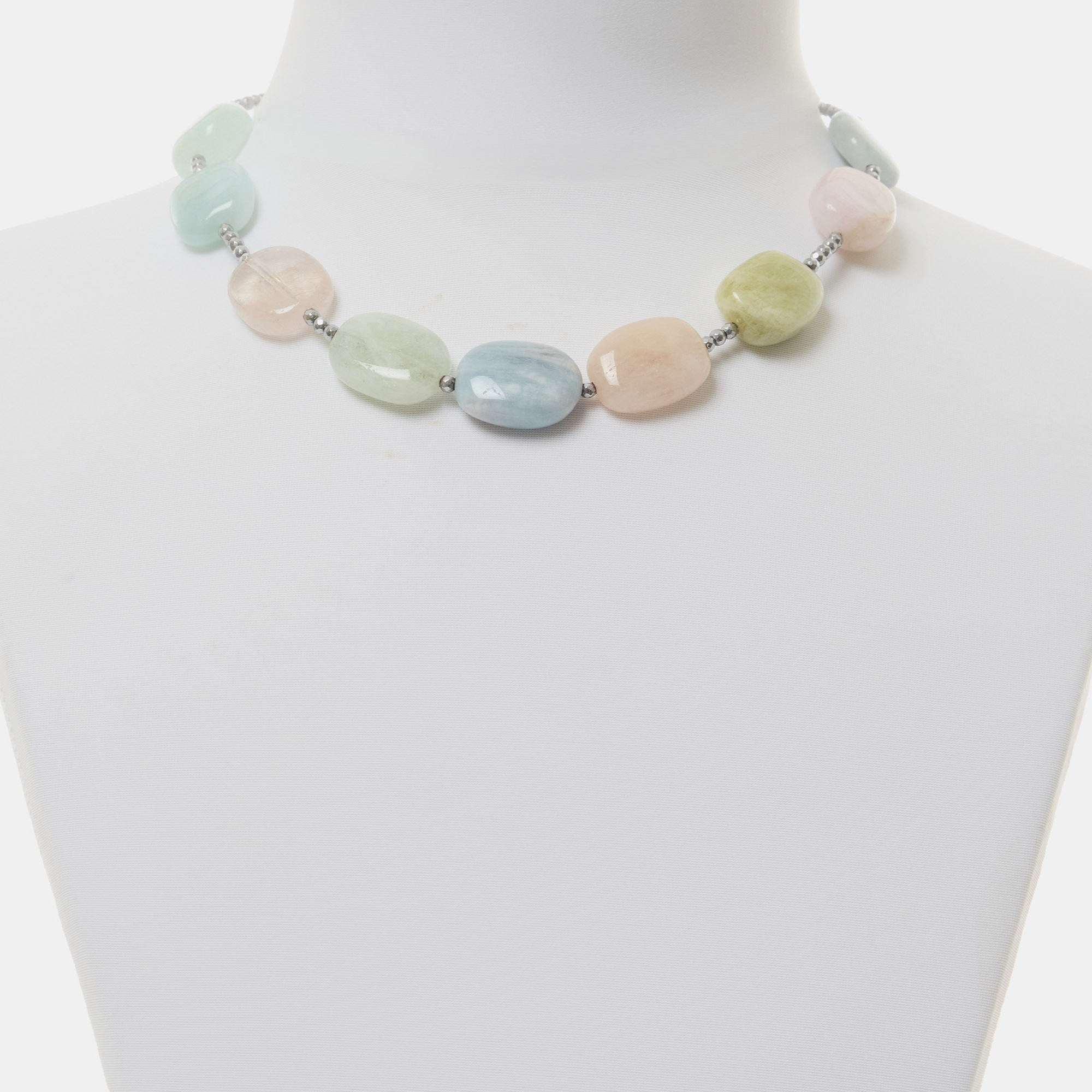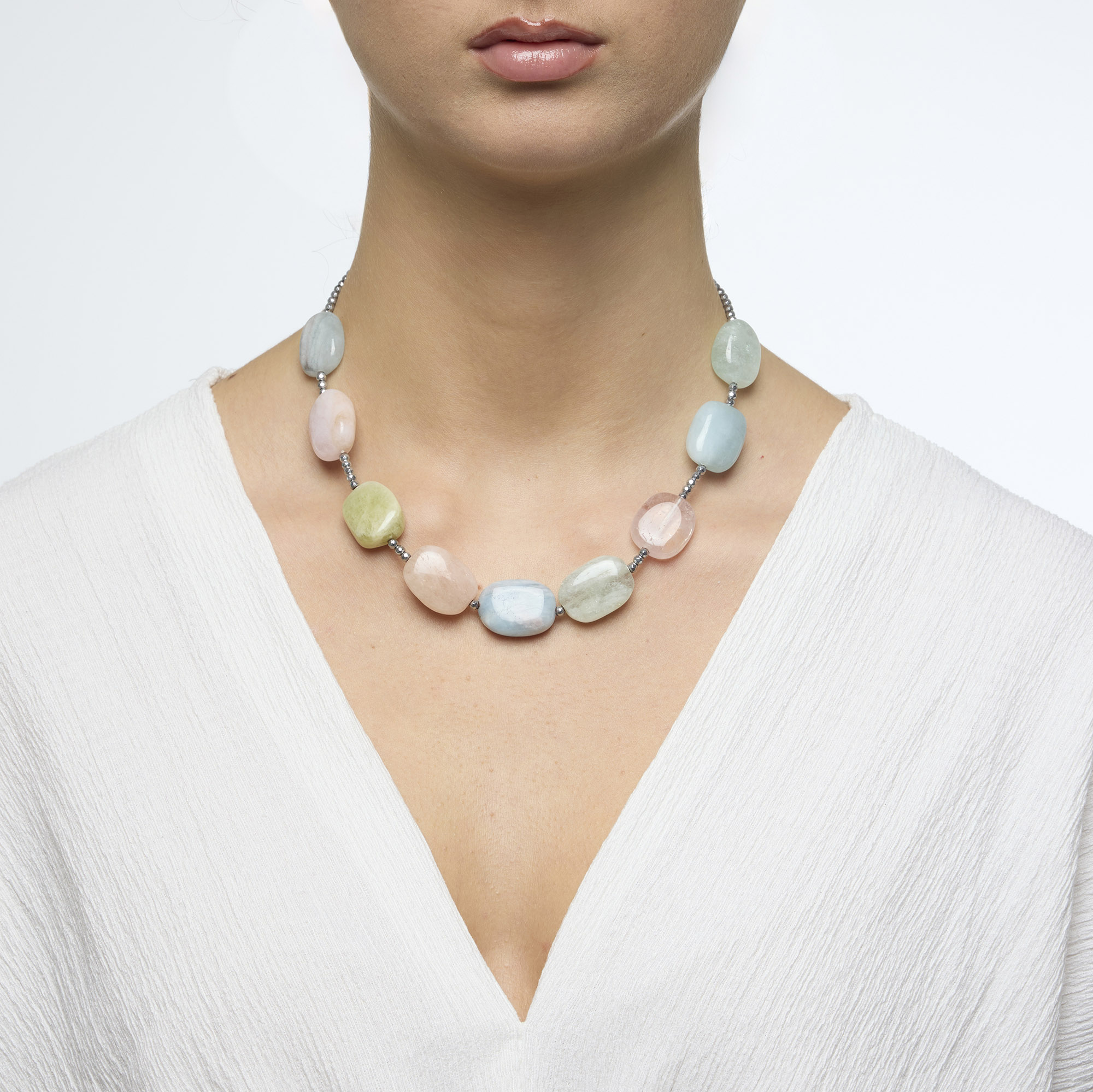 Collana corta infilata in Acquamarina e Morganite, con Ematite rodiata sfaccettata. Chiusura in Argento 925‰ rodiato. Realizzata in Italia.