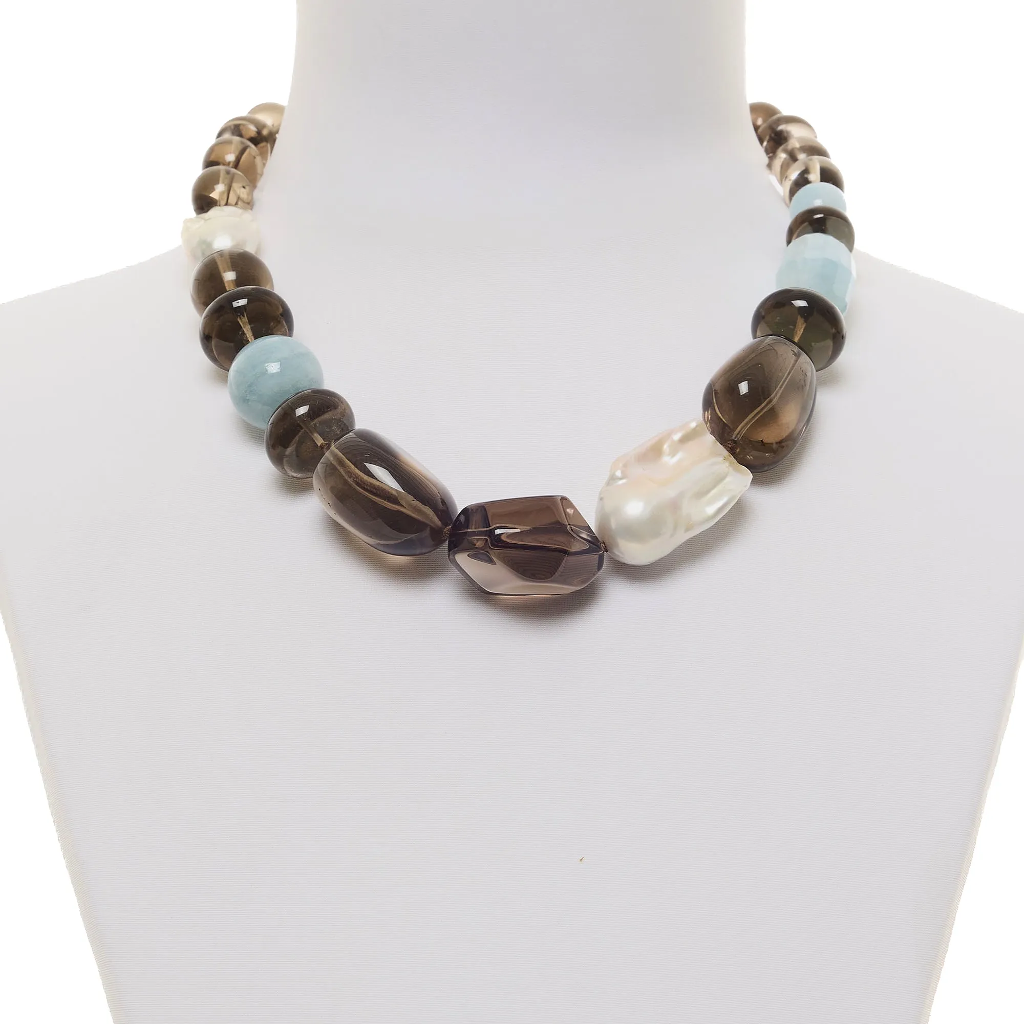 Collana infilata in Acquamarina a sfera liscia e forme sfaccettate, Quarzo Fumè a forme lisce e Perle Barocche bianche. Chiusura in argento 925‰ rodiato. Realizzata in Italia.