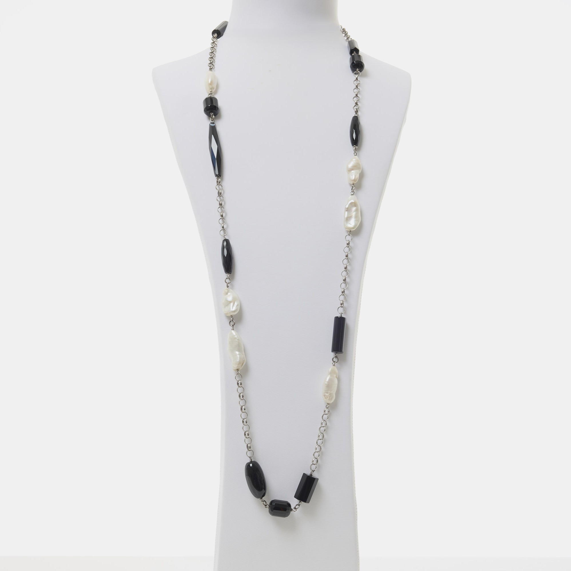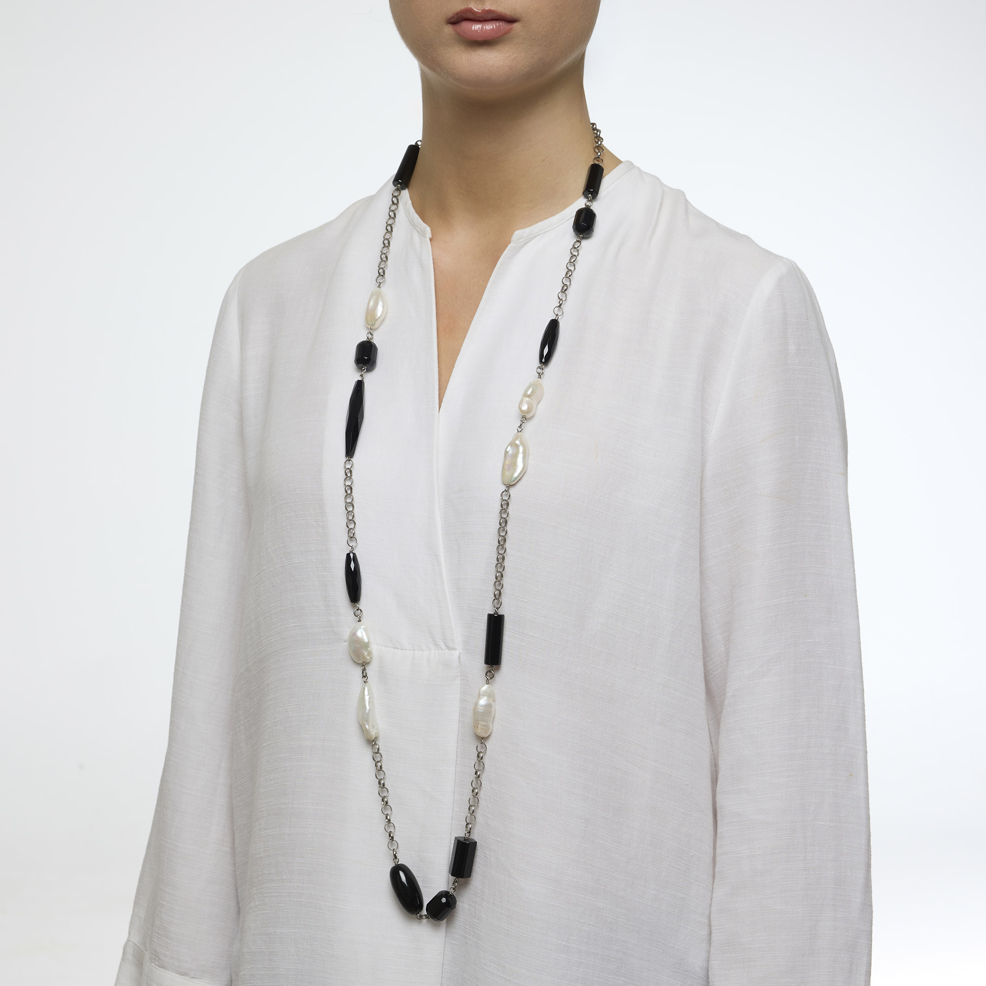 Collana lunga rilegata in Agata nera e Perle, con catena e chiusura in Argento 925‰ rodiato, indossabile anche a doppio giro. Realizzata in Italia.
