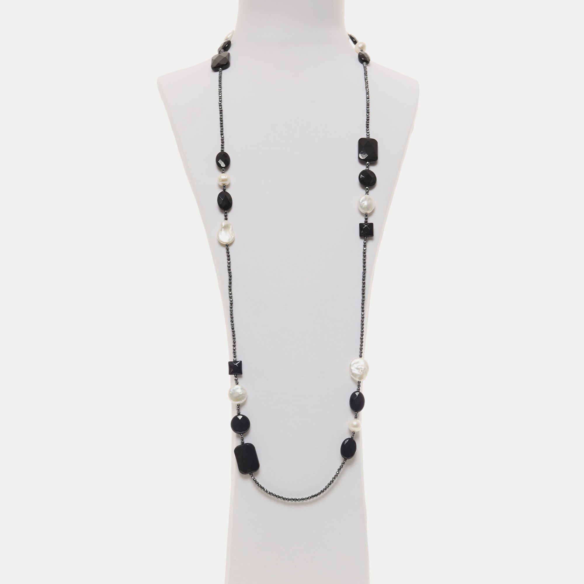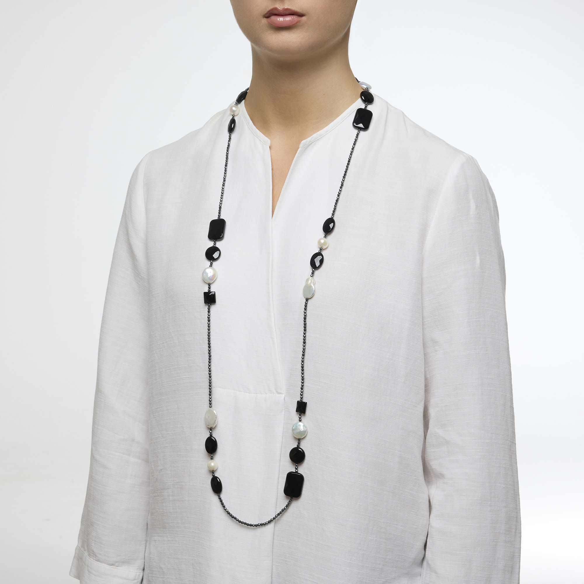 Collana lunga infilata in Agata Nera, Perle d’acqua dolce ed Ematite, senza chiusura. Realizzata in Italia.