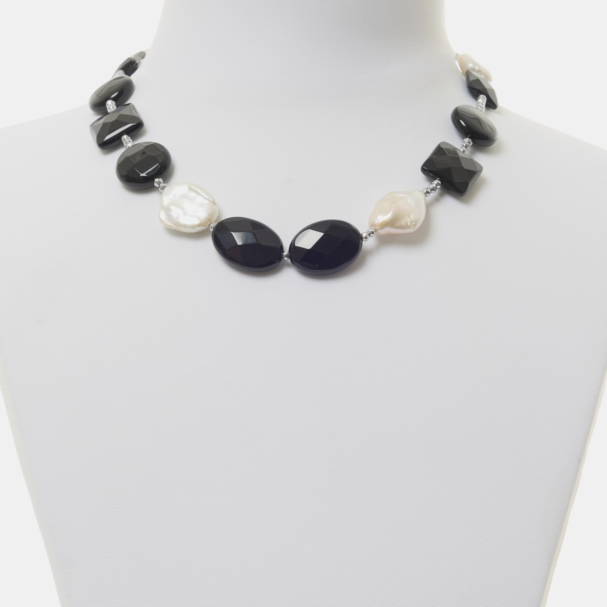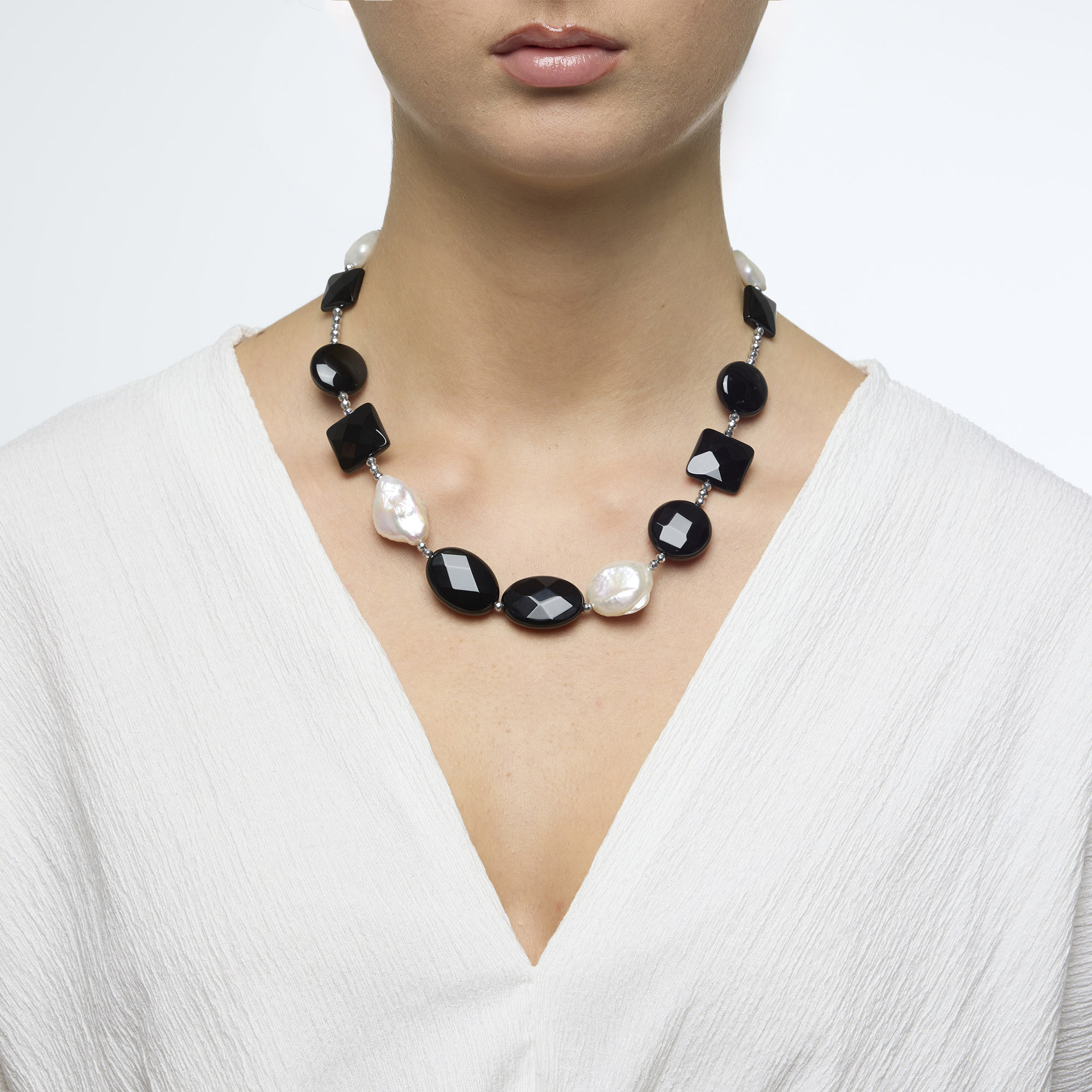 Collana infilata in Agata Nera, Perle d’acqua dolce piatte ed Ematite rodiata. Chiusura in argento 925‰ rodiato. Realizzata in Italia.