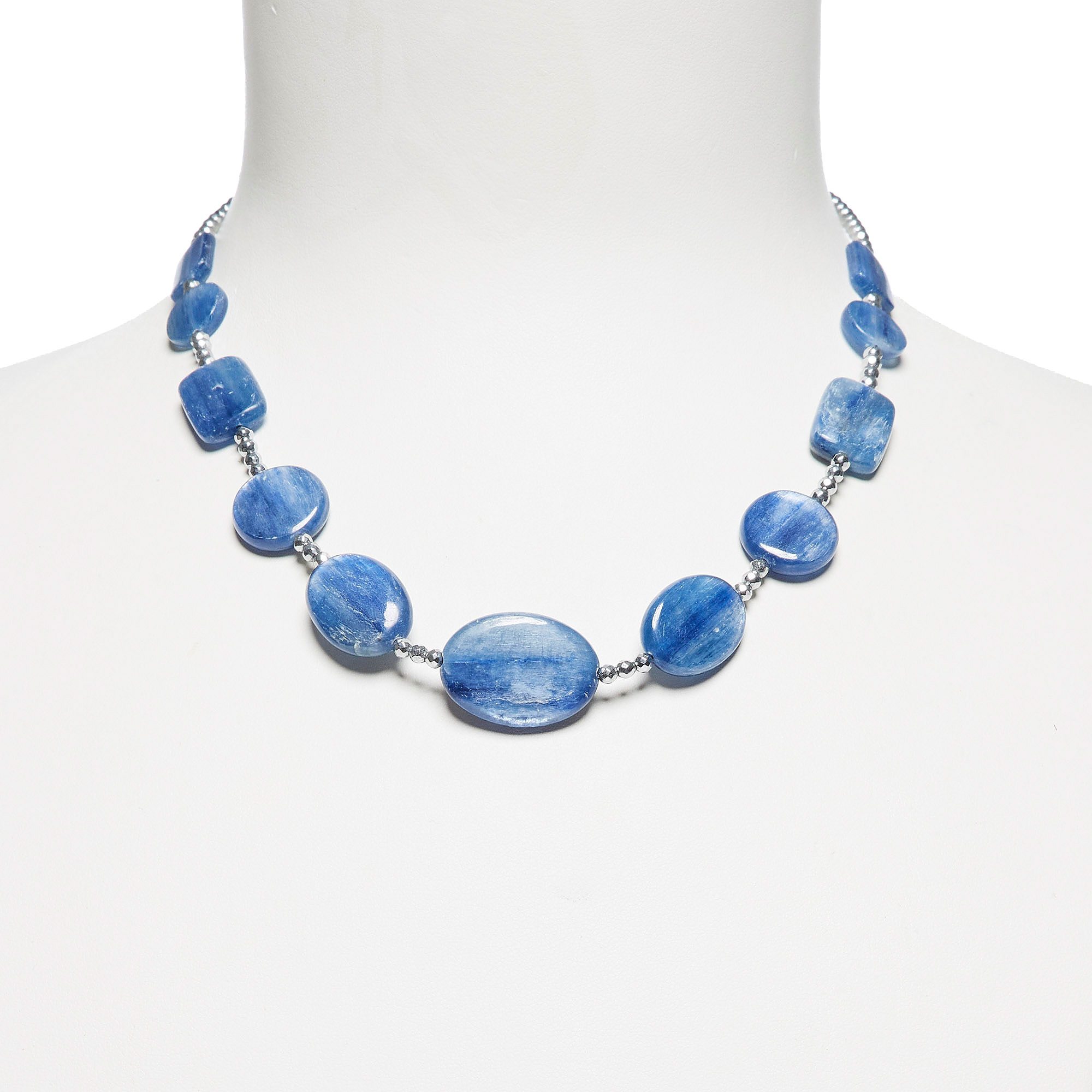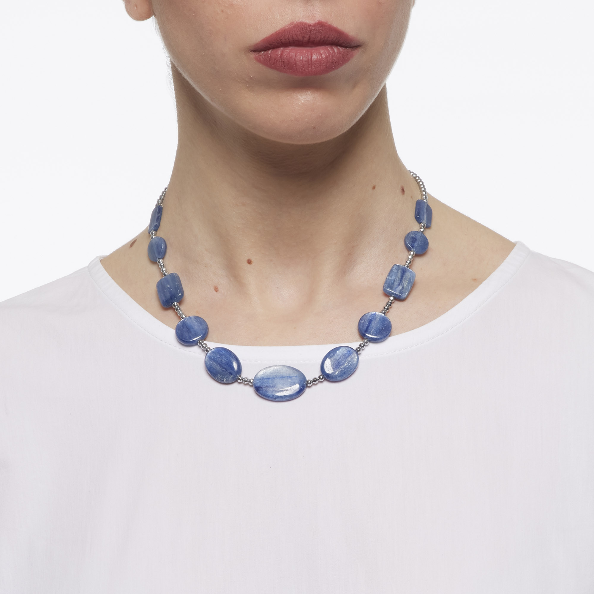 Collana corta infilata in Cianite a forme piatte, con Ematite rodiata. Chiusura in Argento 925‰ rodiato. Realizzata in Italia.