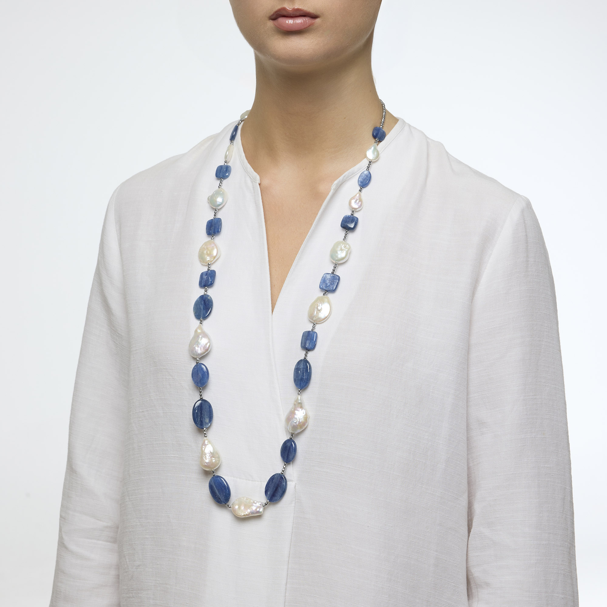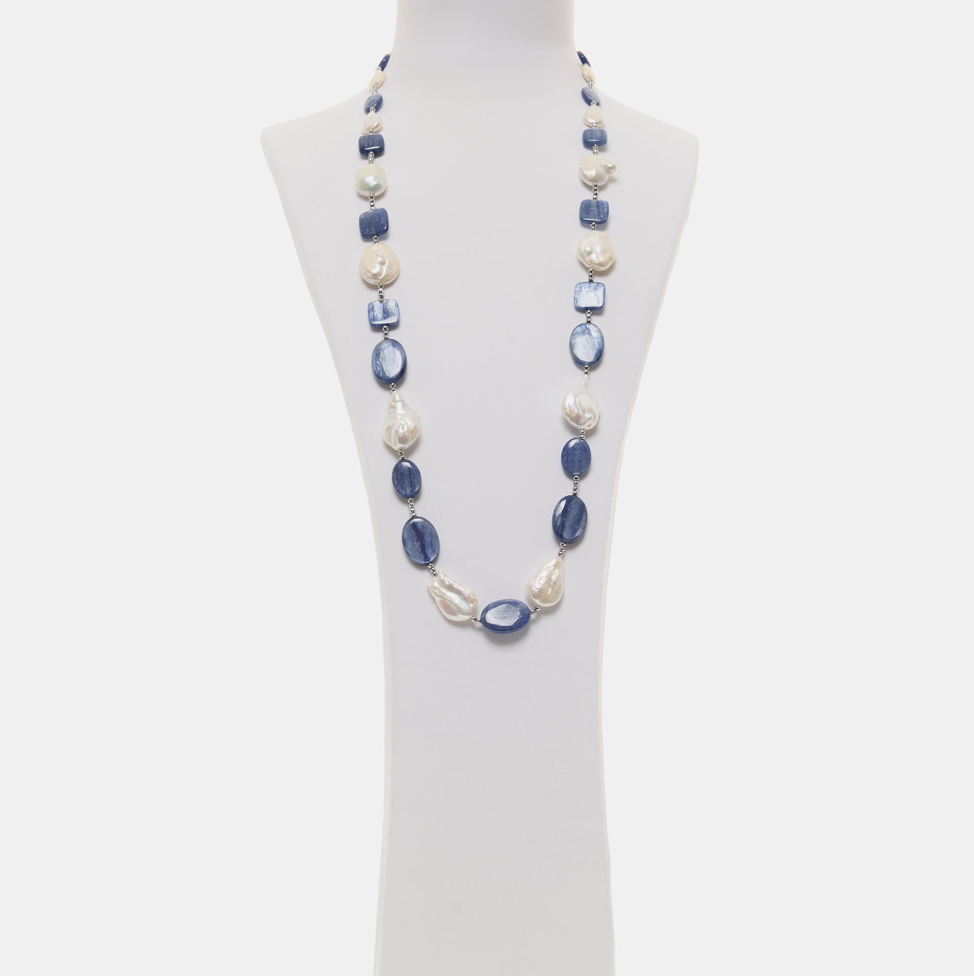 Collana infilata a media lunghezza in Cianite, con Perle barocche piatte ed Ematite rodiata. Chiusura in Argento 925‰ rodiato. Realizzata in Italia.
