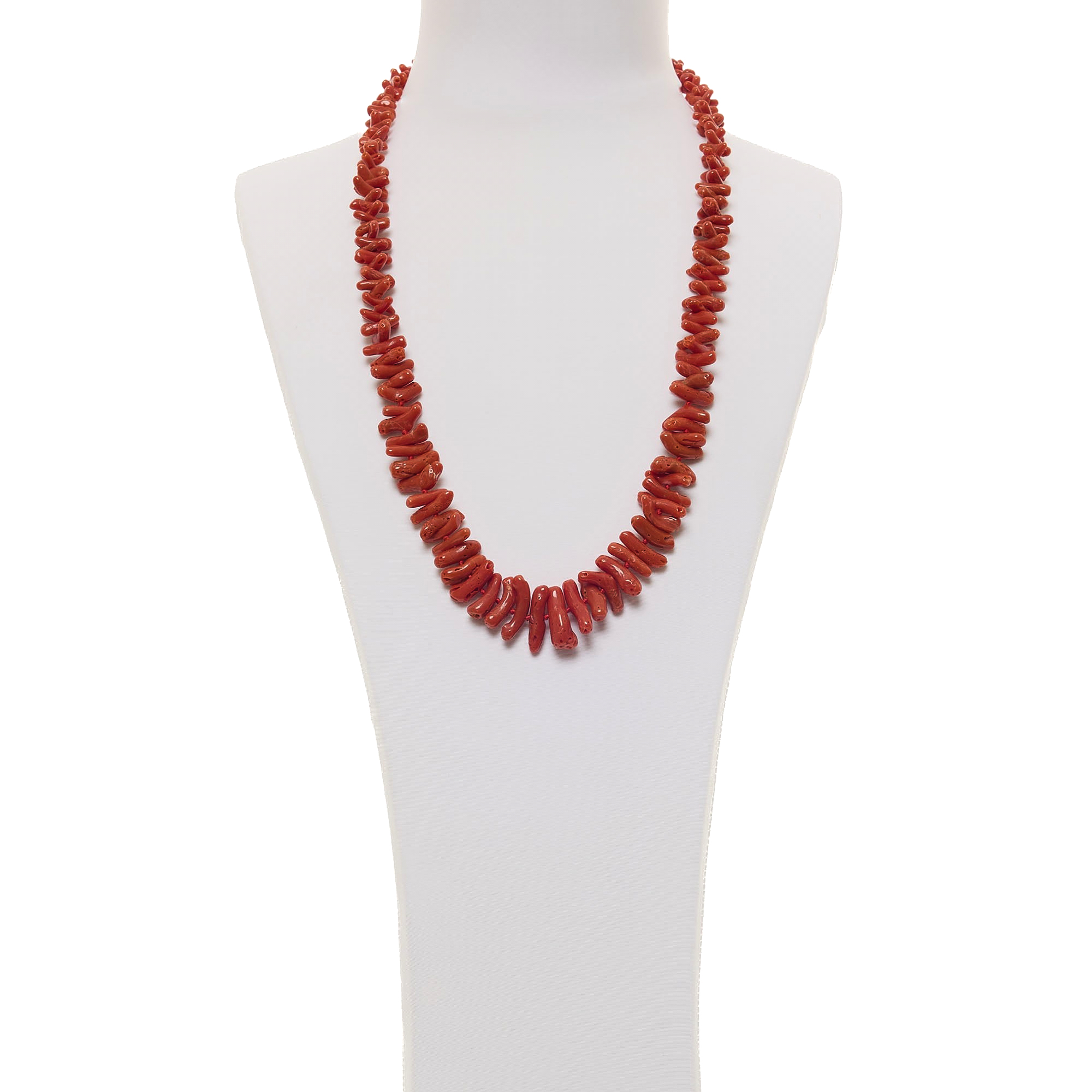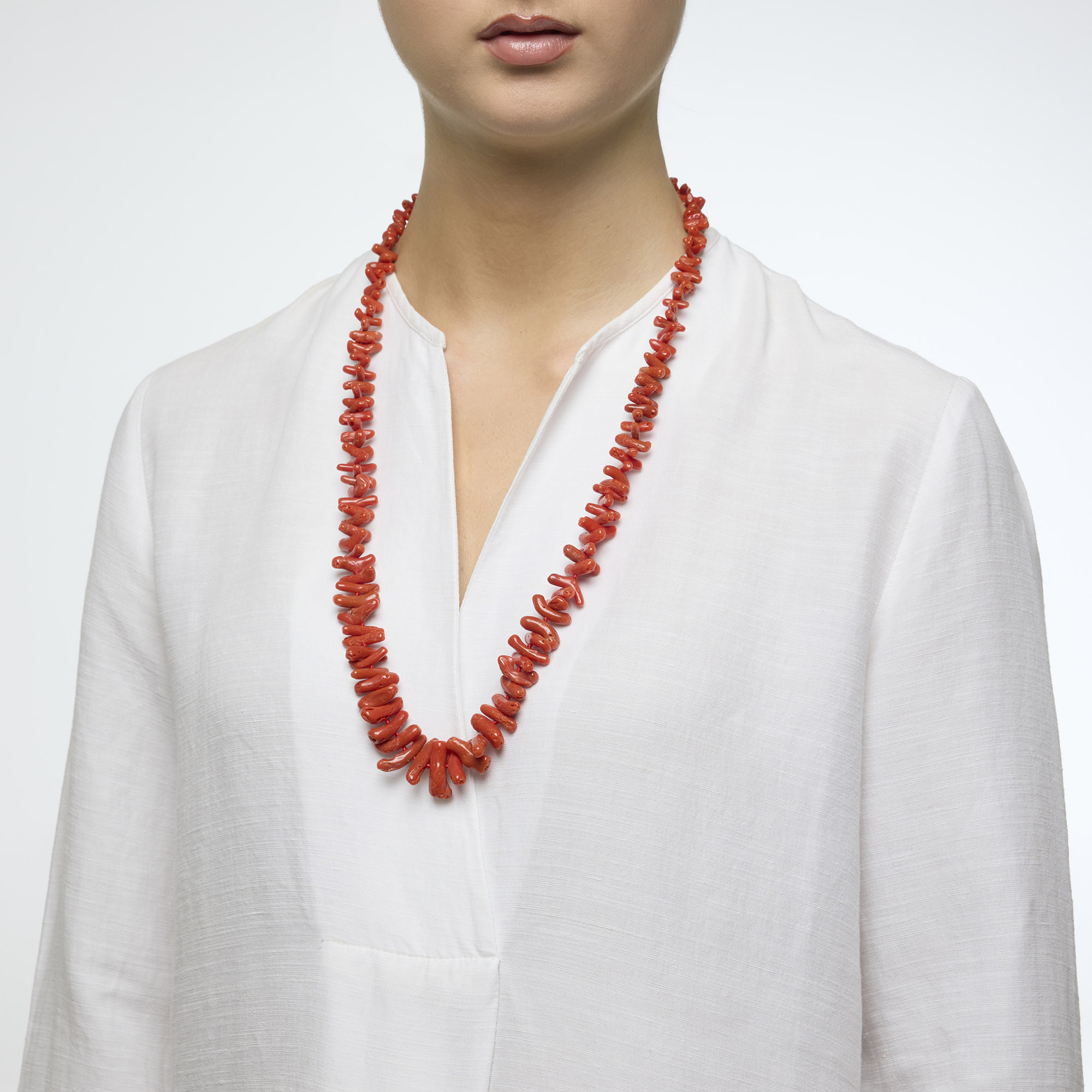 Collana infilata di media lunghezza con frange di Corallo rosso. Chiusura in argento 925‰ rodiato. Realizzata in Italia.