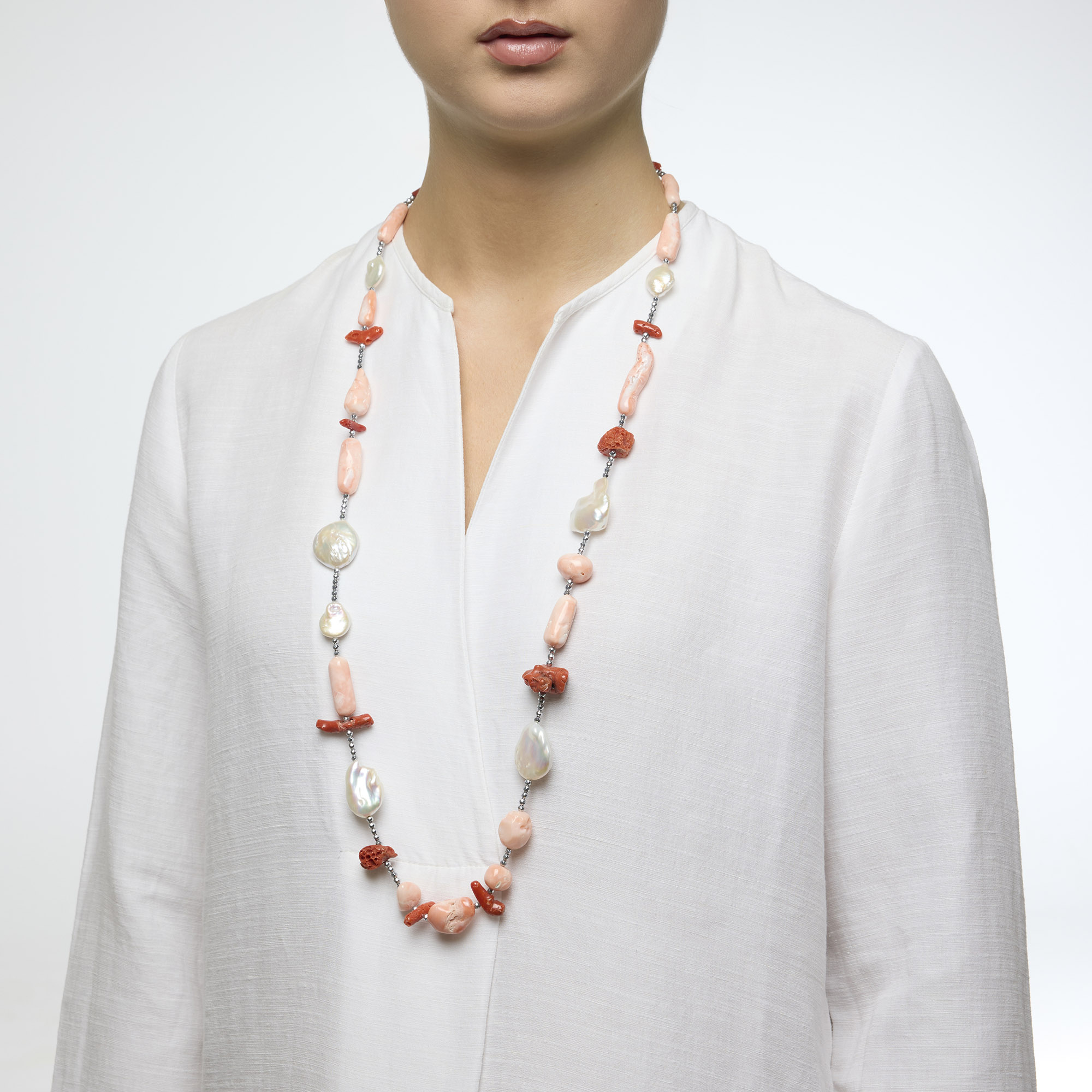 Collana infilata in Corallo Rosso, Perle d’acqua dolce e Corallo Pelle d’Angelo, con Ematite rodiata. Chiusura in argento 925‰ rodiato. Realizzata in Italia.