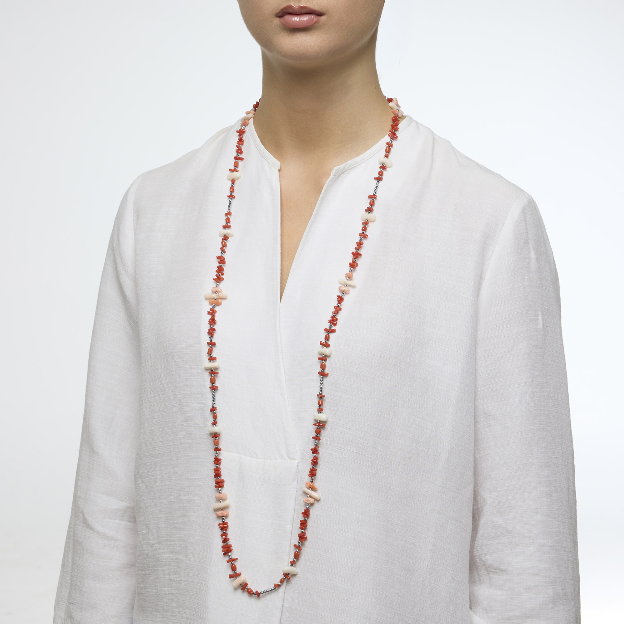 Collana infilata lunga in Corallo rosso e Corallo Pelle d’Angelo, con Ematite rodiata. Realizzata in Italia.