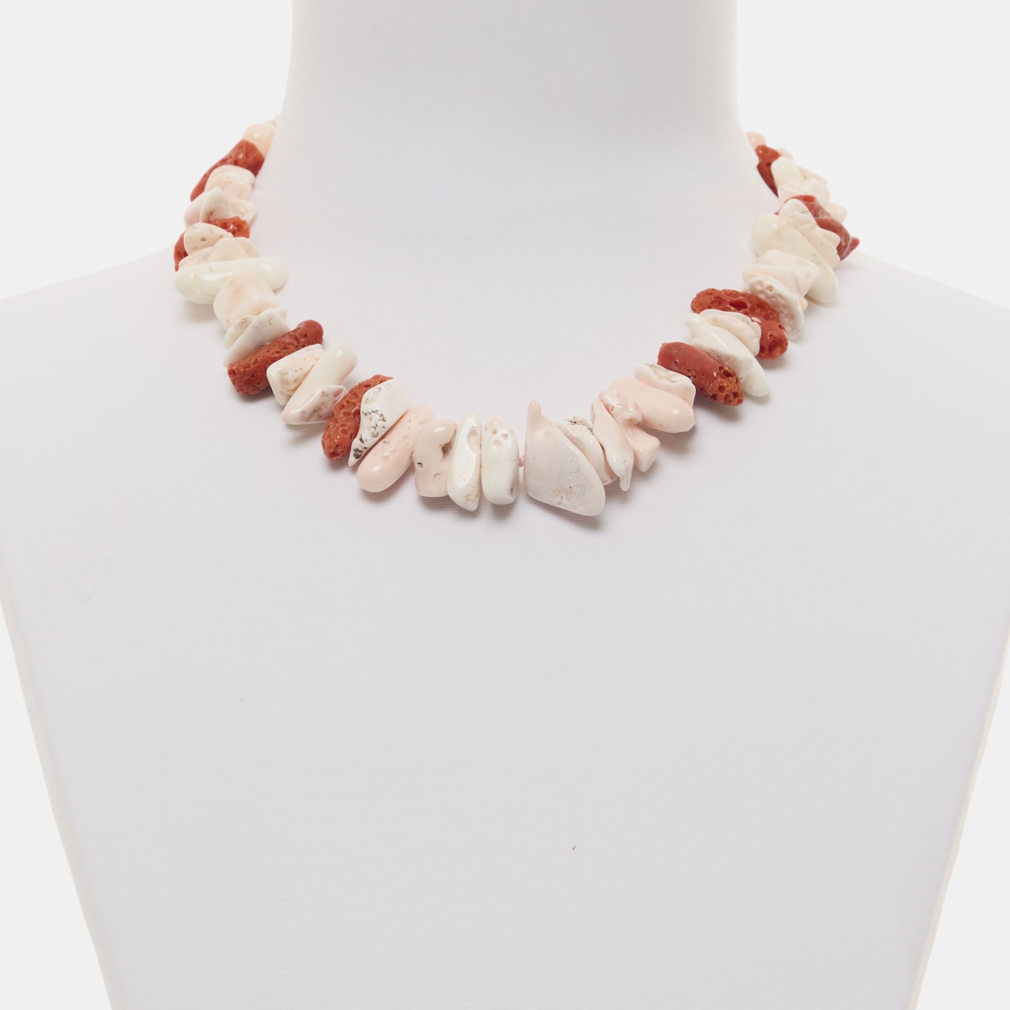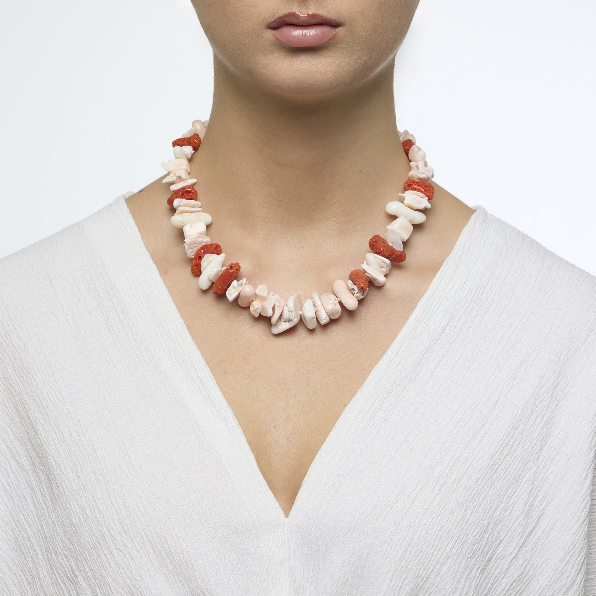 Collana infilata corta in Corallo rosso e Corallo Pelle d’Angelo, a chips e forme irregolari. Chiusura in argento 925‰ rodiato. Realizzata in Italia.