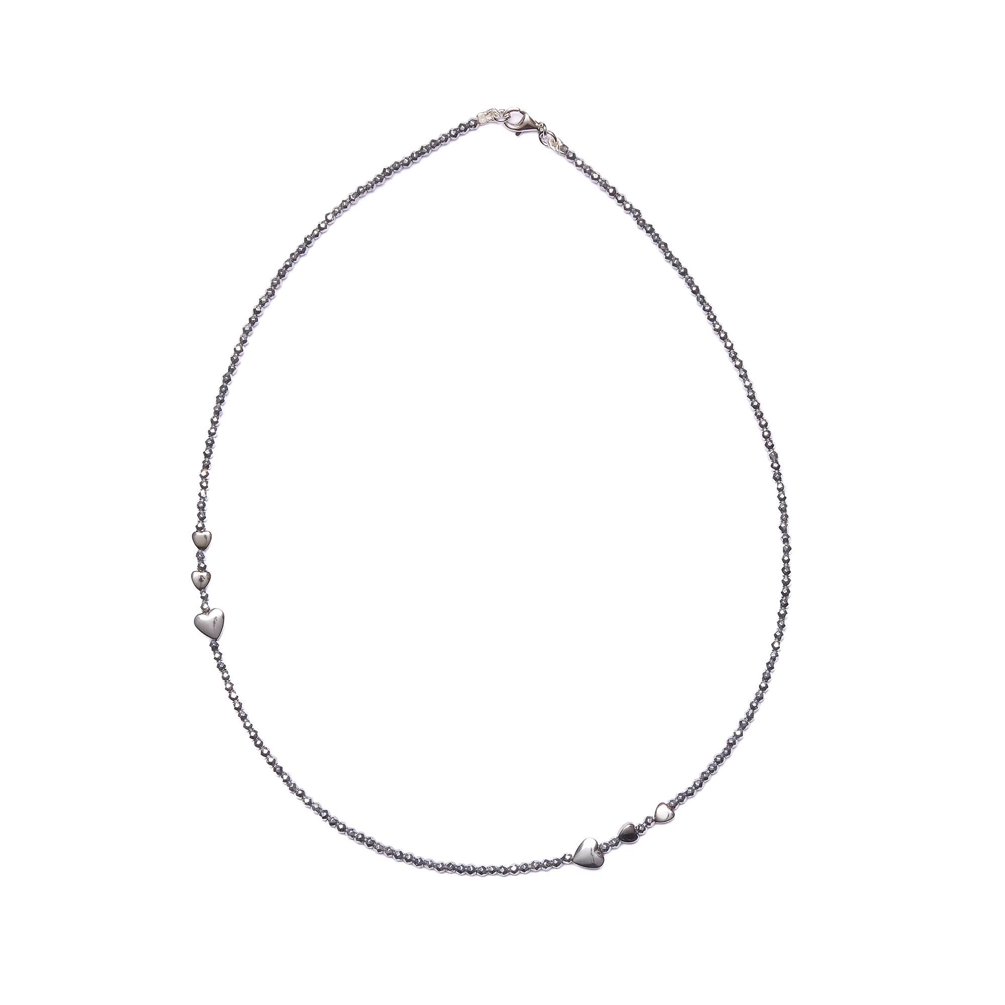 Collana a girocollo infilata in Ematite Rodiata con elementi a Cuore in Ematite rodiata a gradazione. Chiusura in Argento 925‰ rodiato. Realizzata in Italia.