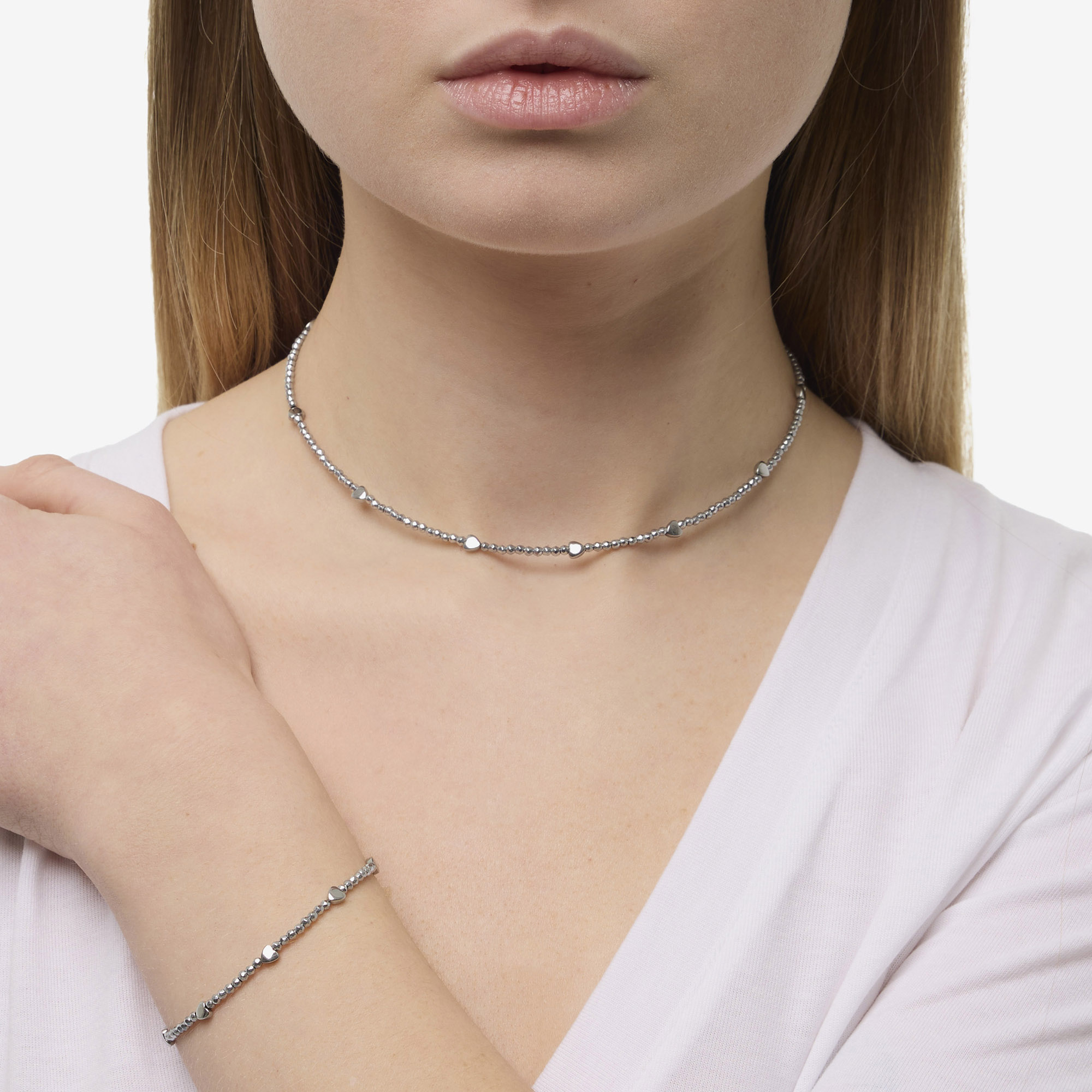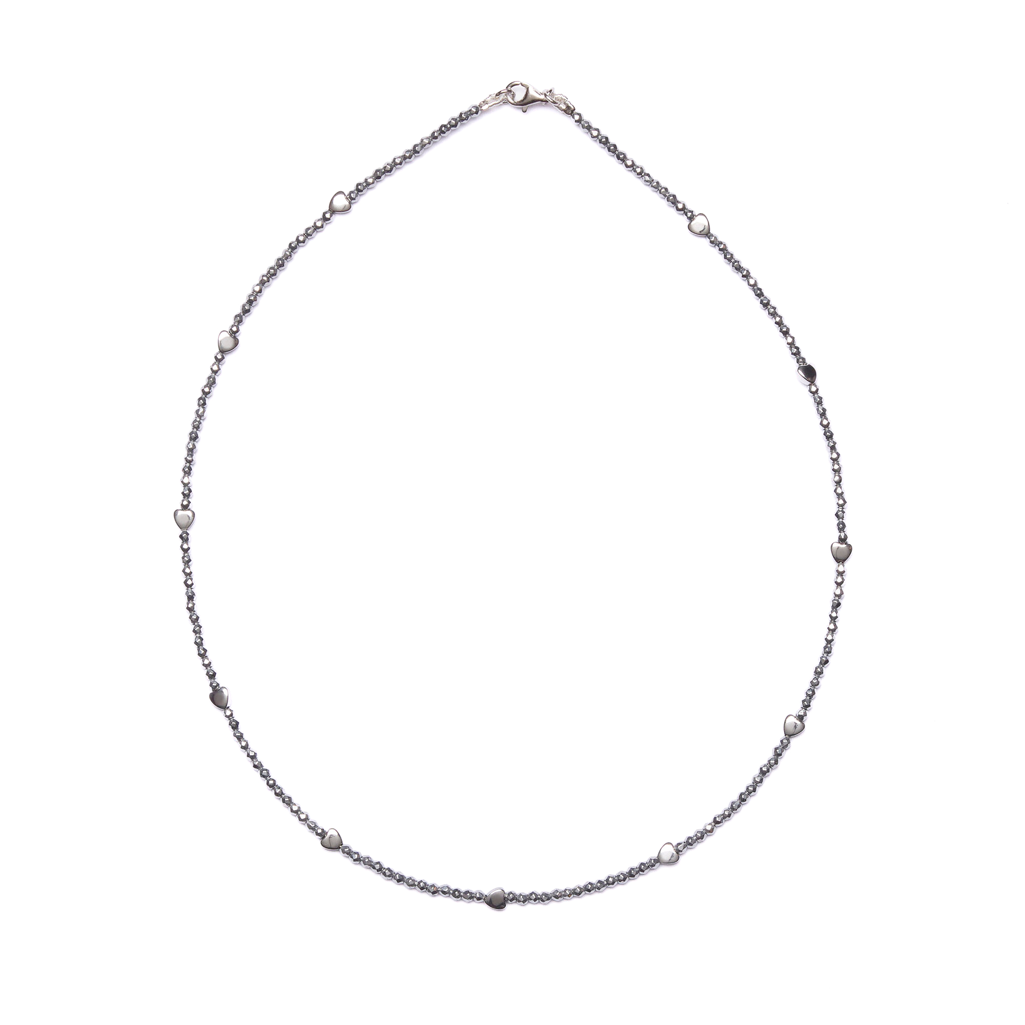 Collana infilata in Ematite Rodiata con elementi a Cuore in Ematite rodiata. Chiusura in Argento 925‰ rodiato. Realizzata in Italia.