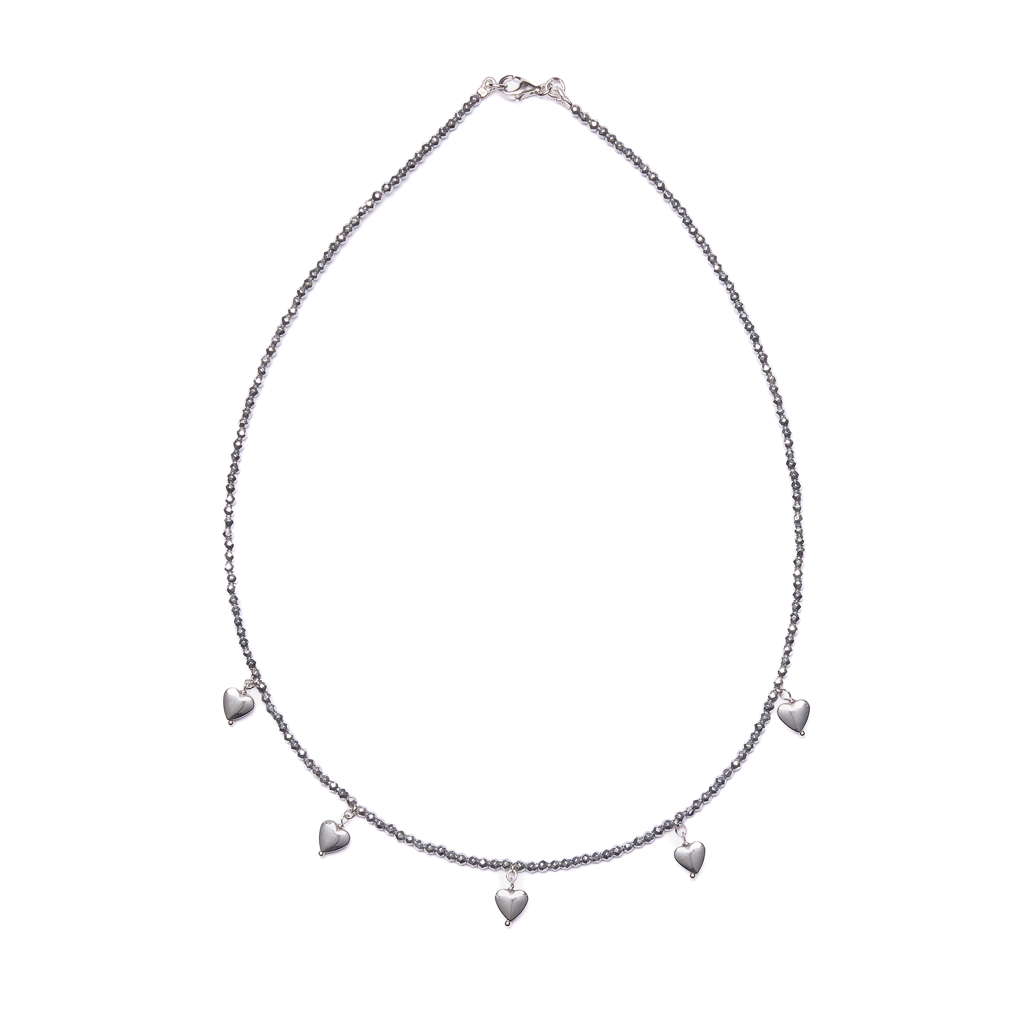 Collana a girocollo infilata in Ematite Rodiata con elementi Charms a Cuore in Ematite rodiata. Chiusura in Argento 925‰ rodiato. Realizzata in Italia.