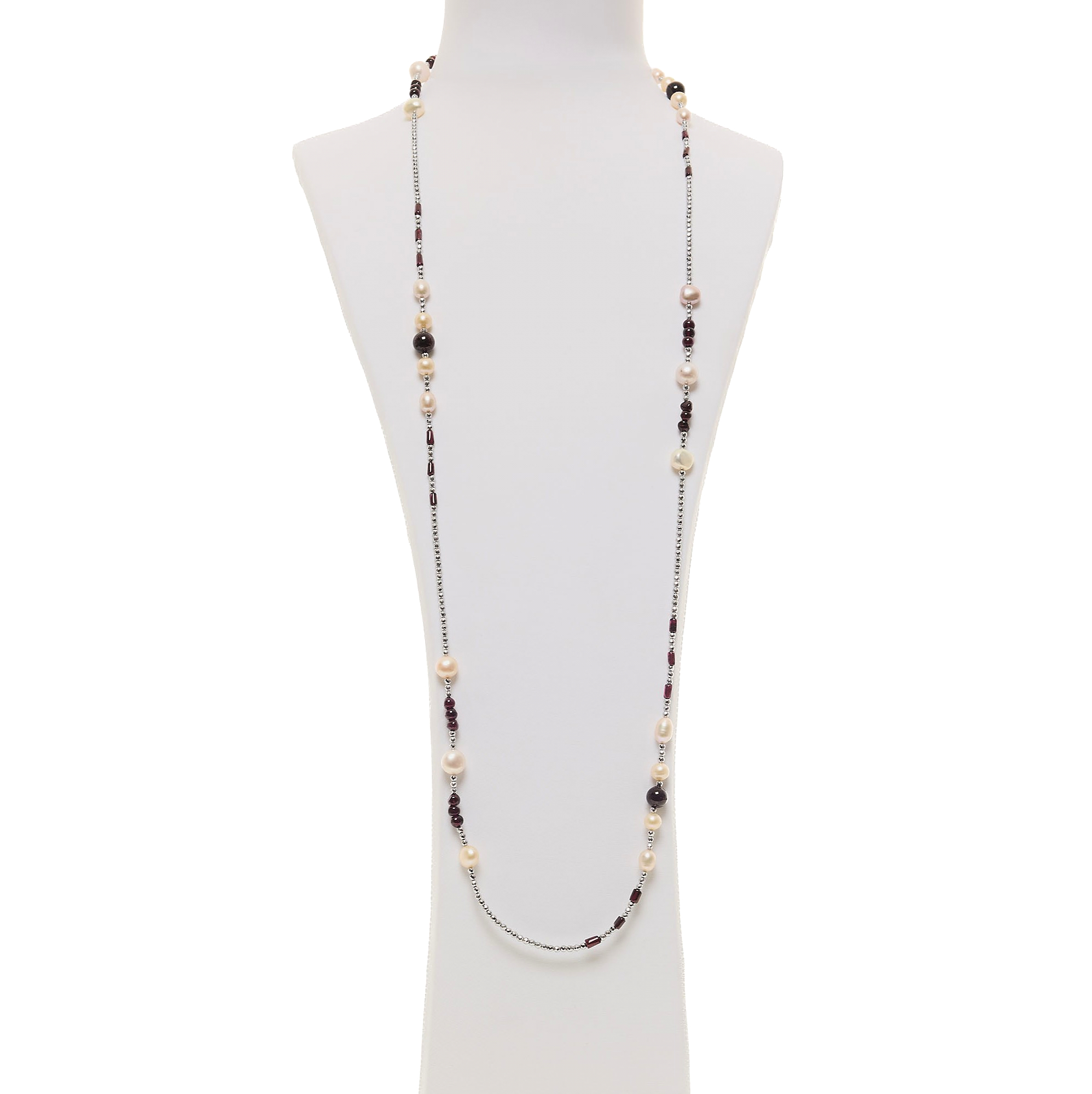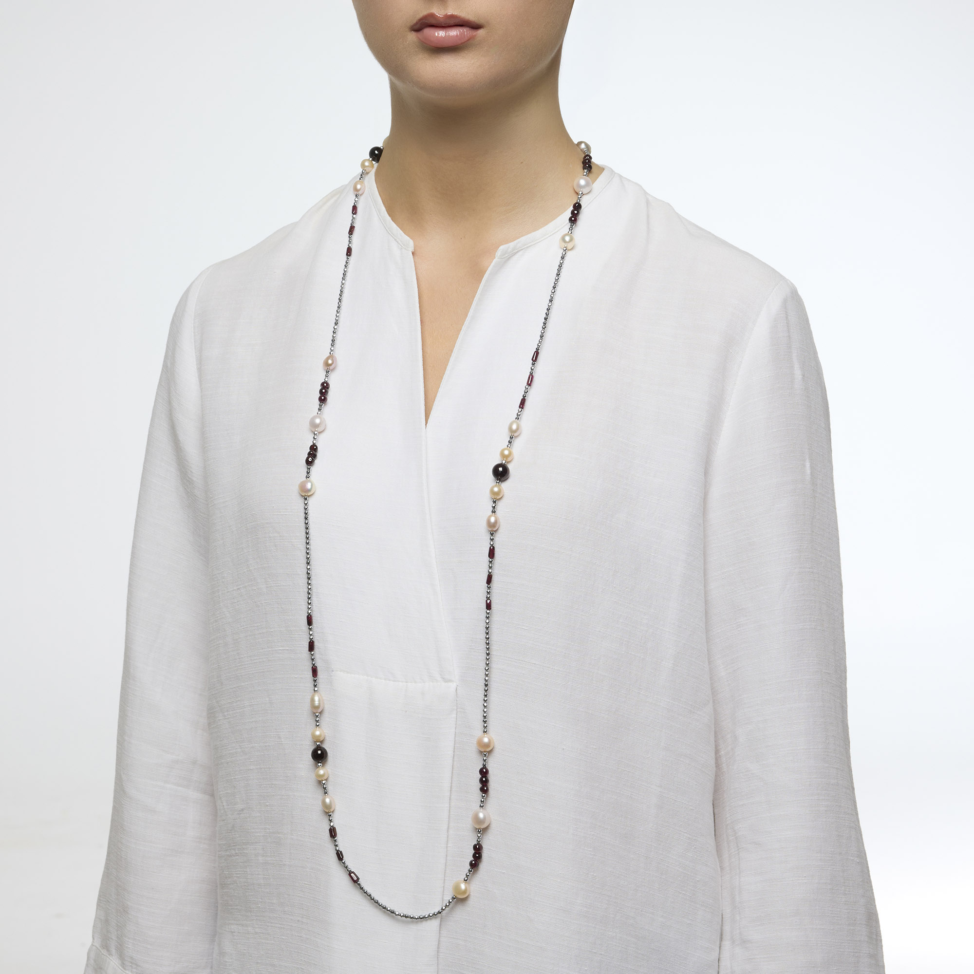 Collana lunga infilata in Granato e Perle d’acqua dolce, con Ematite Rodiata. Realizzata in Italia.
