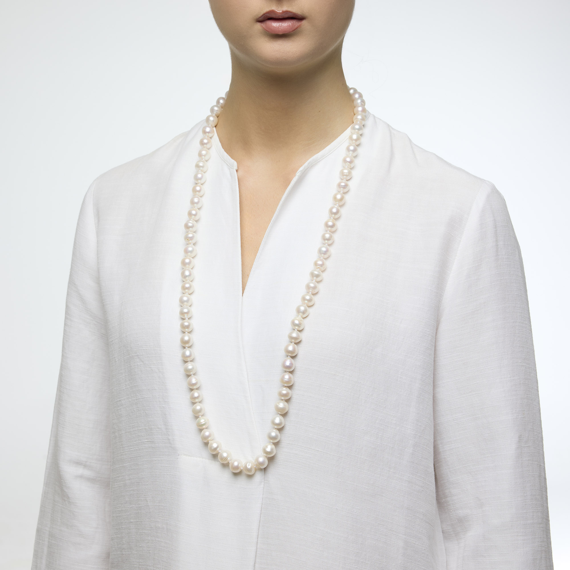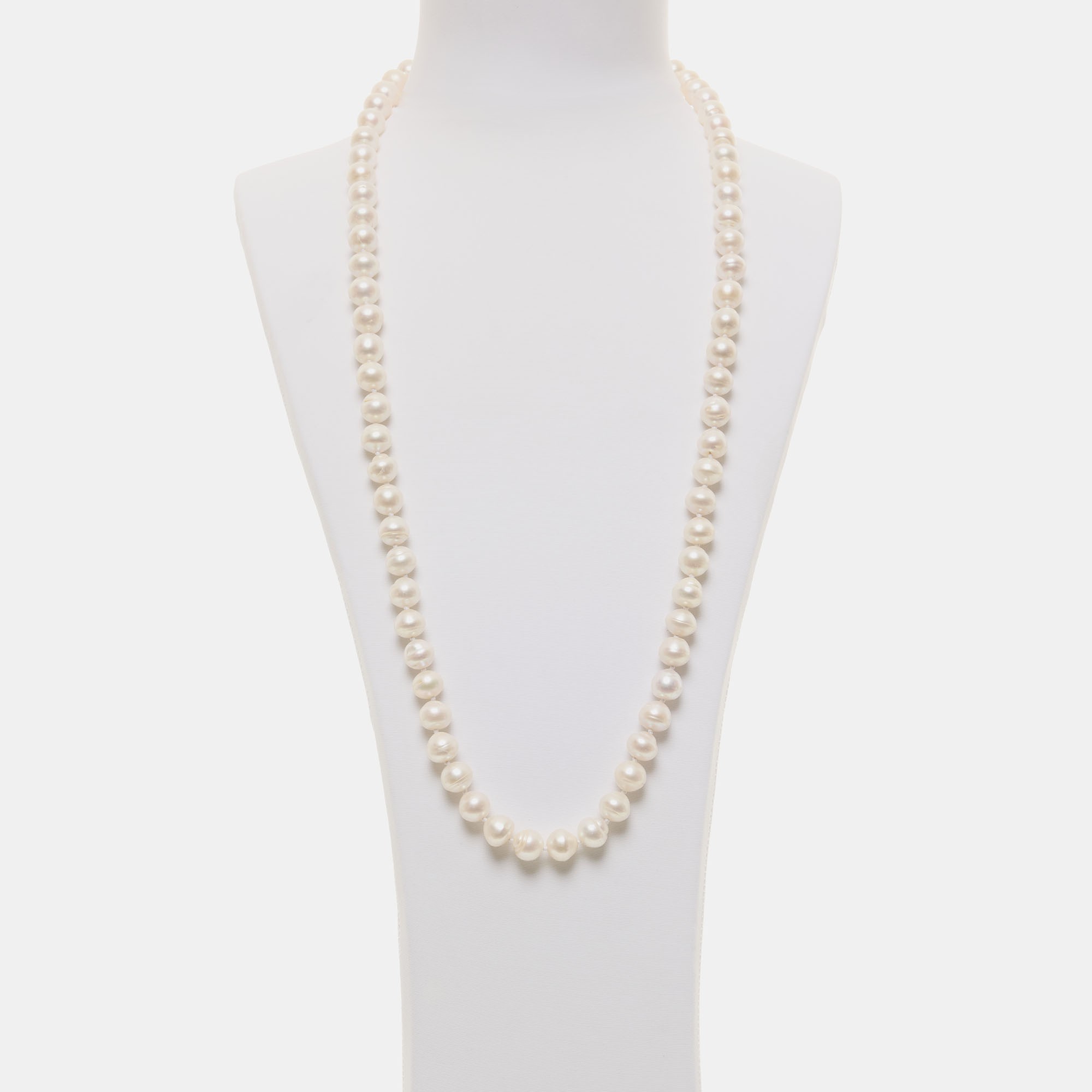 Collana infilata di media lunghezza in Perle d’acqua dolce bianche. Chiusura in argento 925‰ rodiato. Realizzata in Italia.